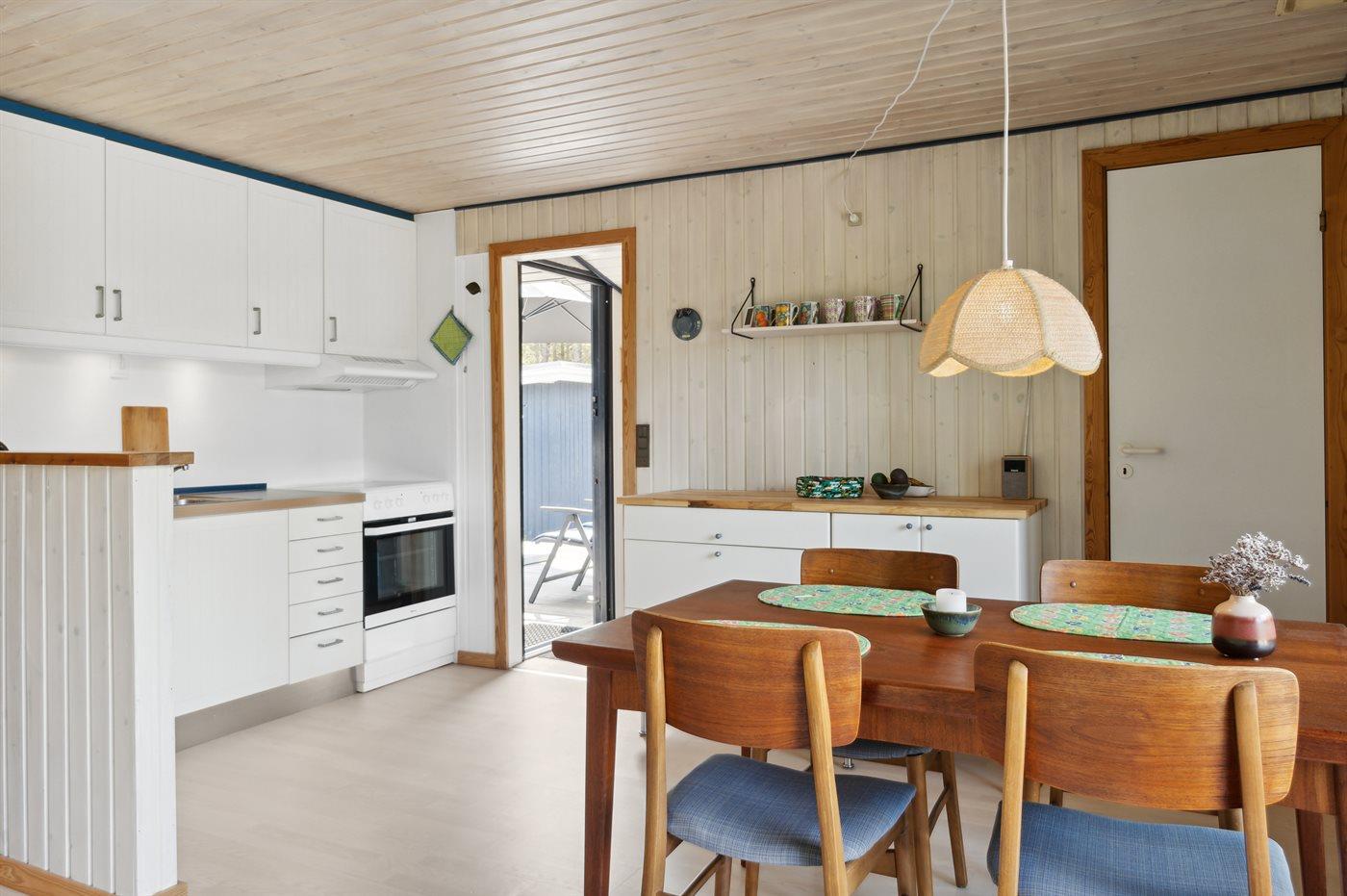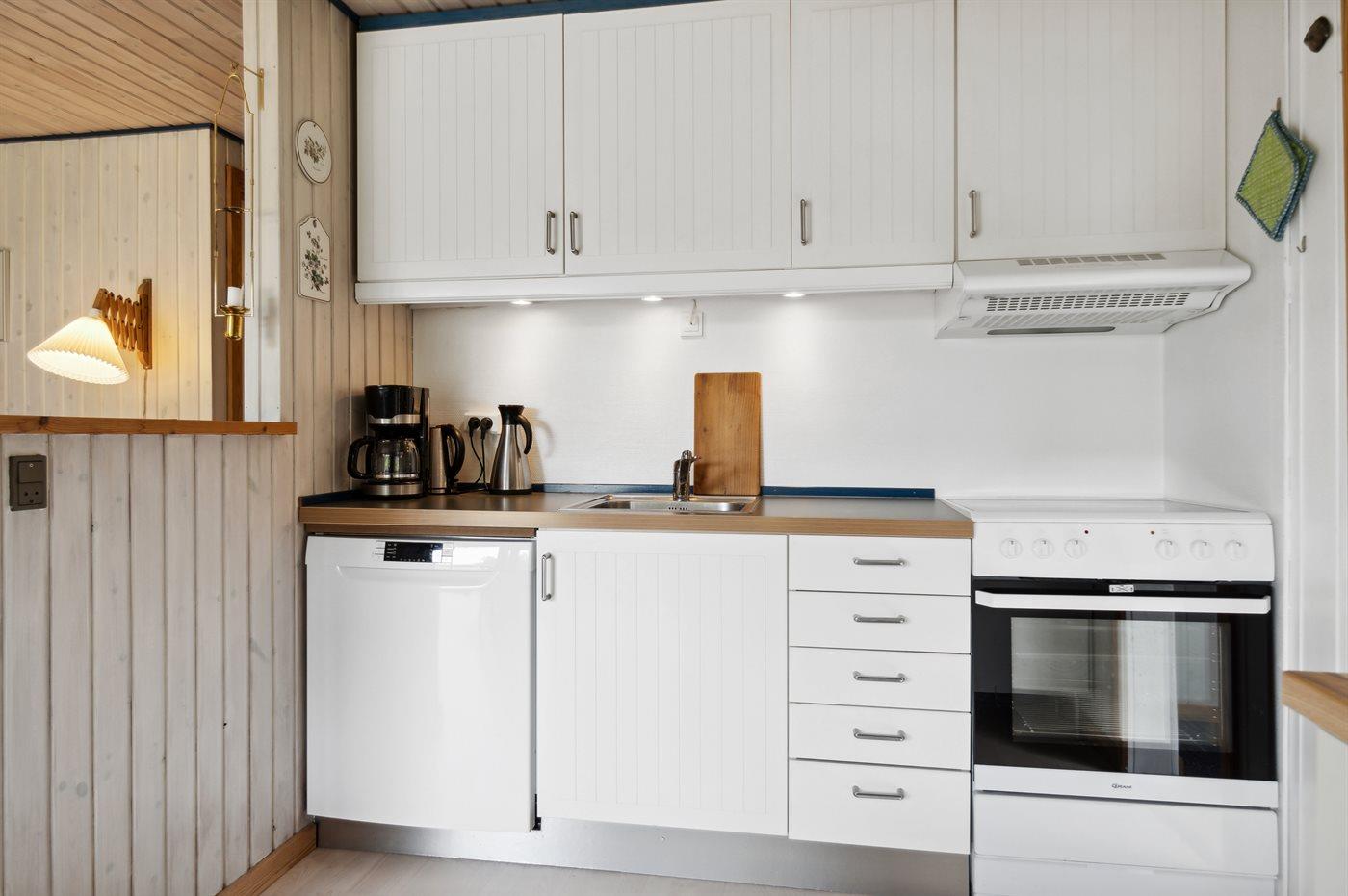 Køkkenet er udstyret med 1 køleskab. Der er 4 keramiske kogeplader, varmluftovn, mikrobølgeovn samt opvaskemaskine.