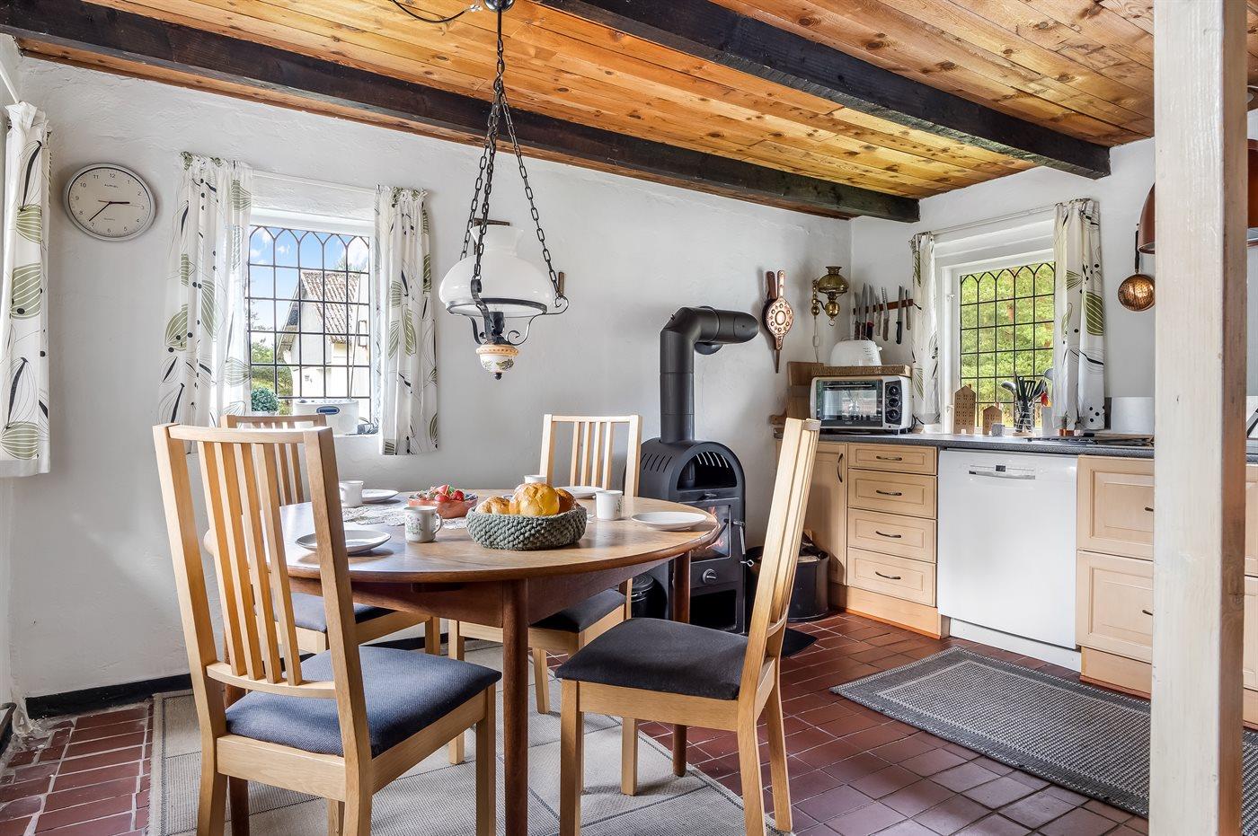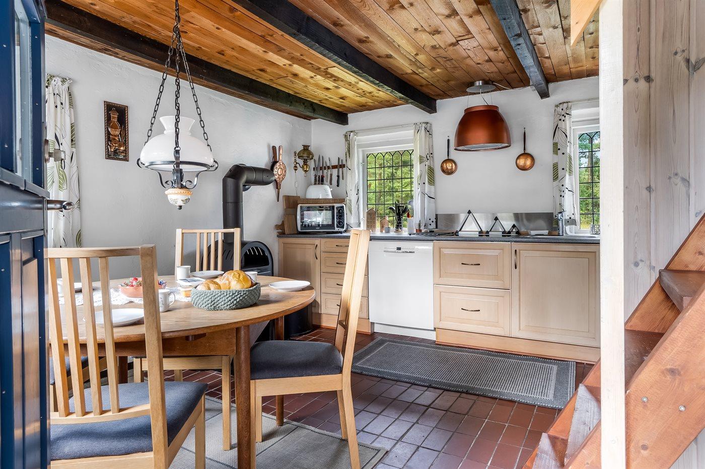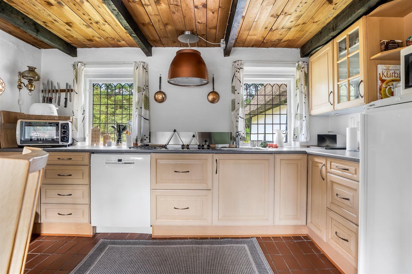Køkkenet er udstyret med 1 køleskab. Der er 4 keramiske kogeplader, miniovn, mikrobølgeovn samt opvaskemaskine.