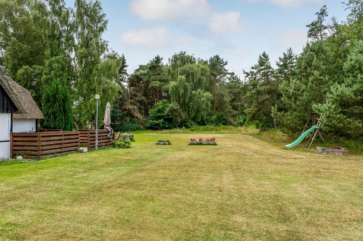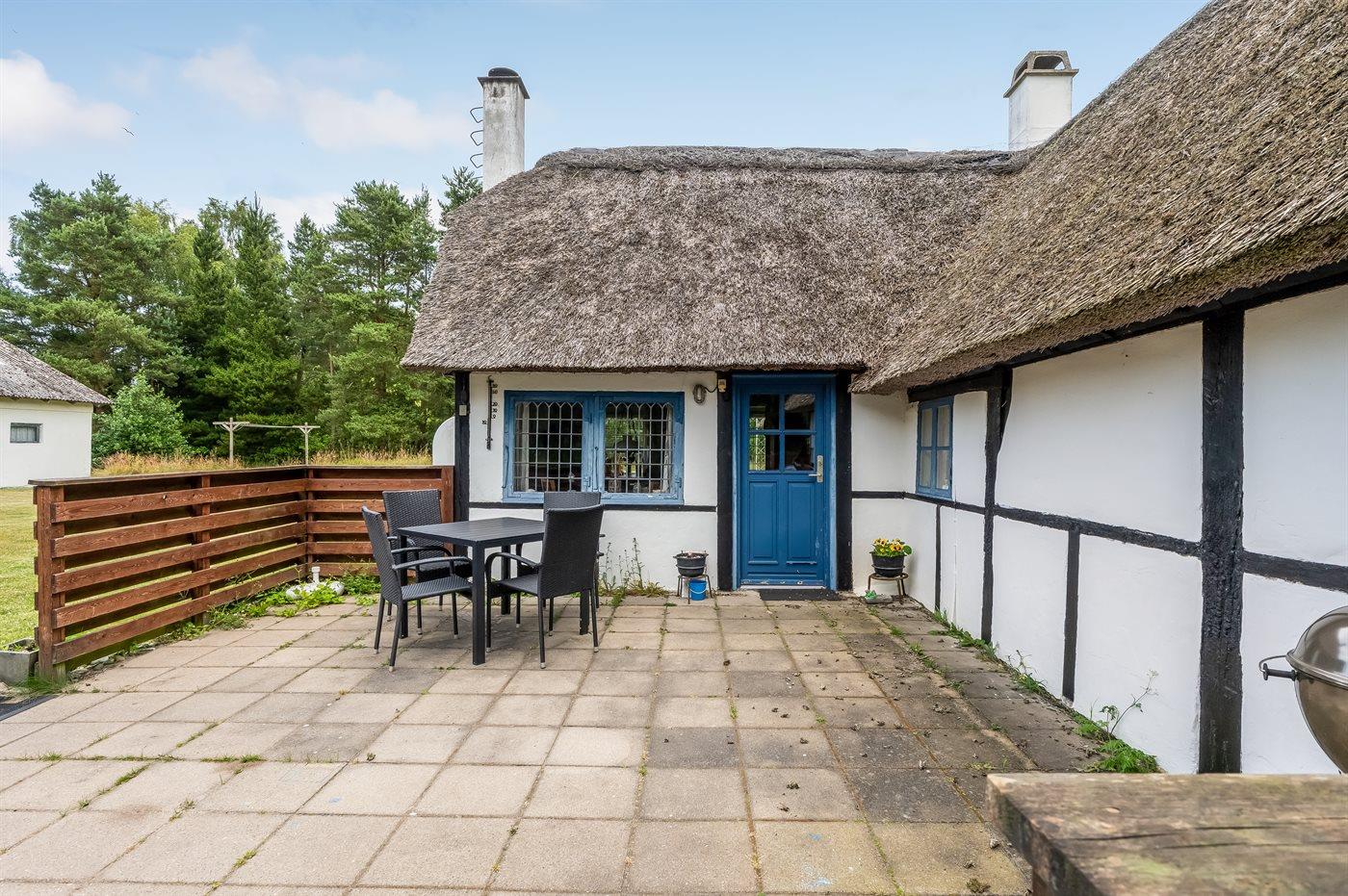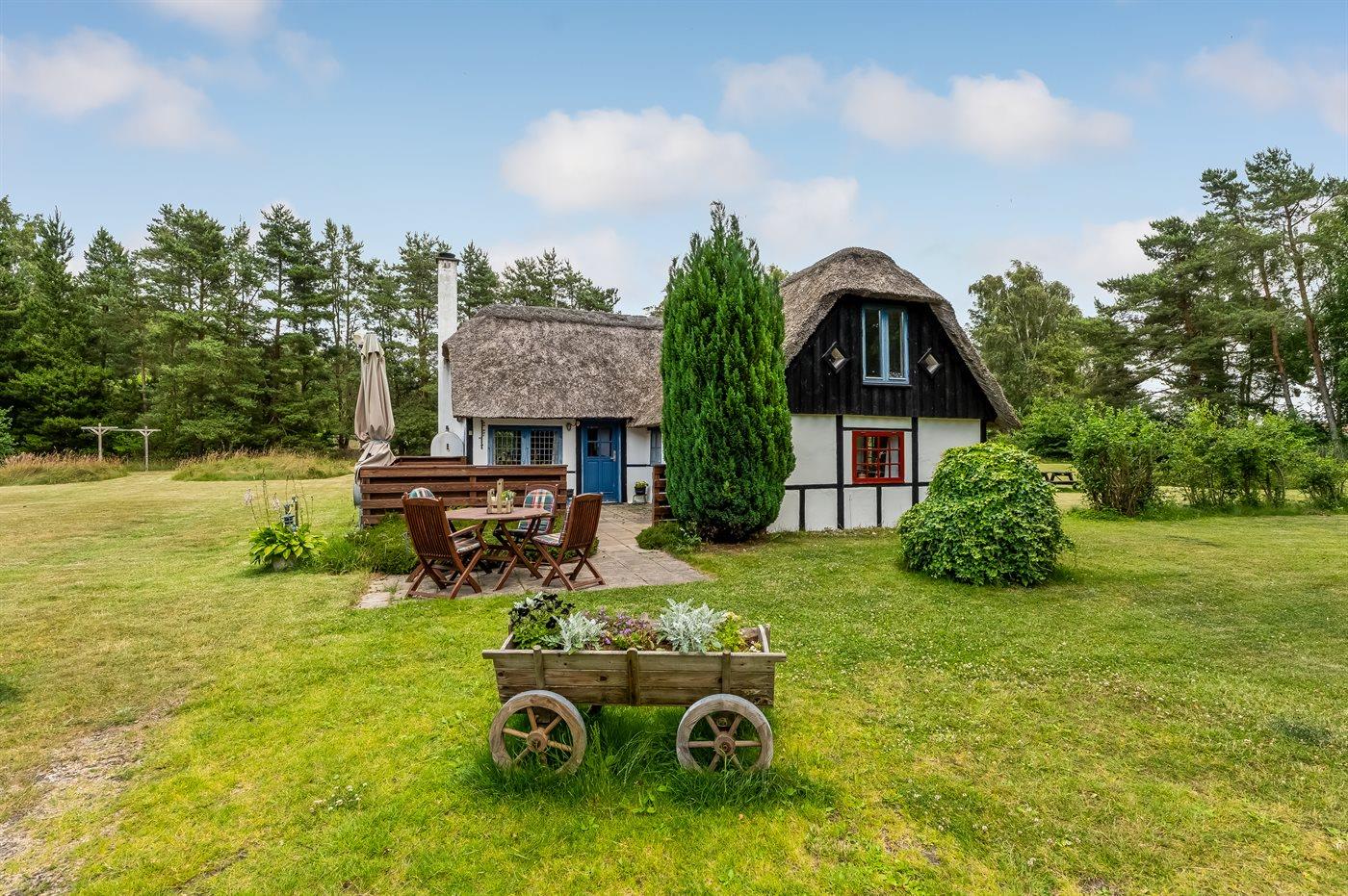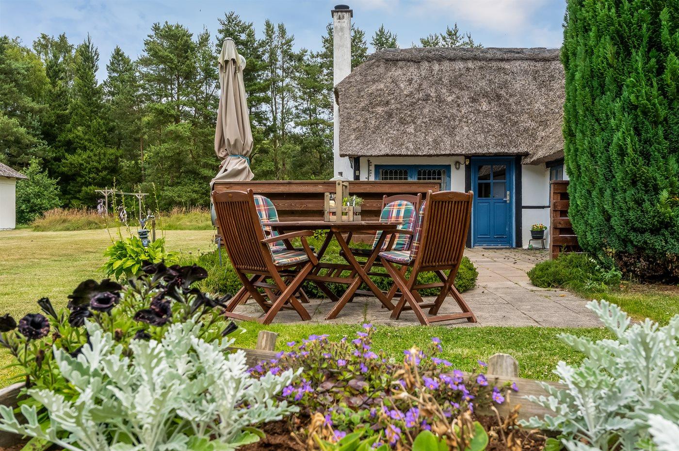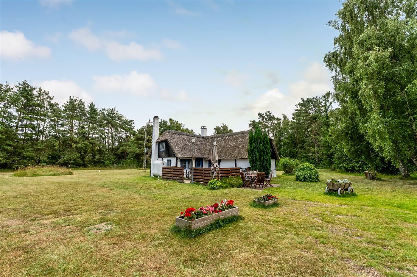 Et charmerende sommerhus med stråtag, beliggende helt ugenert i naturskønne omgivelser, på en stor græsgrund med træer. Der er ikke langt til øens flotte badestrand ”Danzigmann”, skov med mulighed for lange gåture og havnemiljøet.