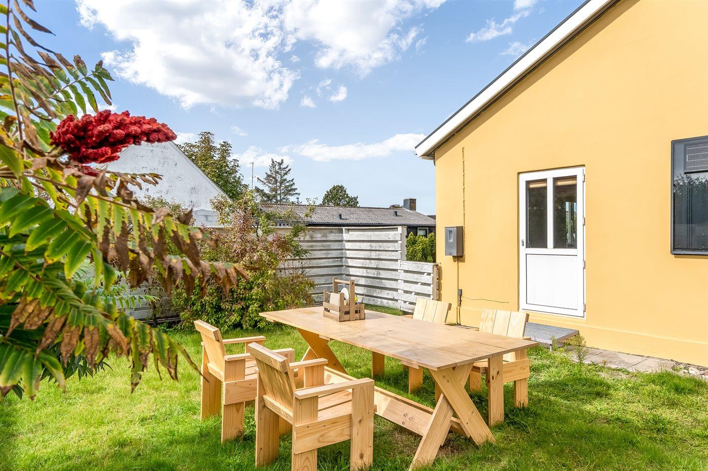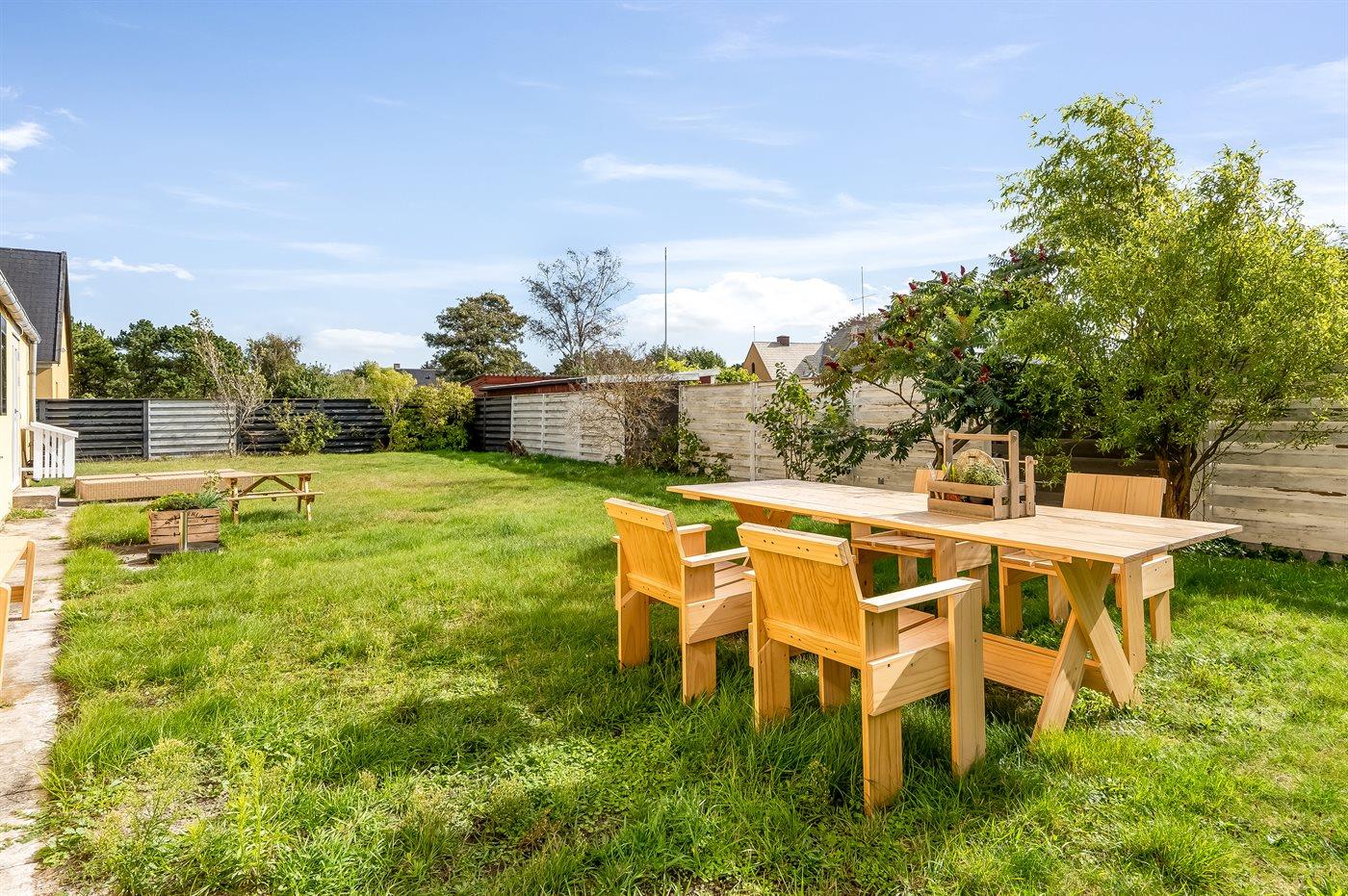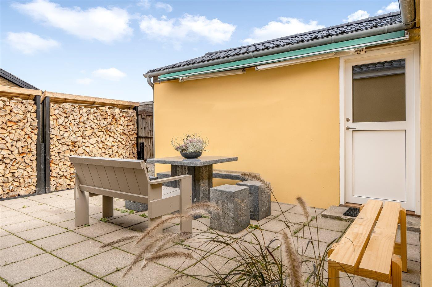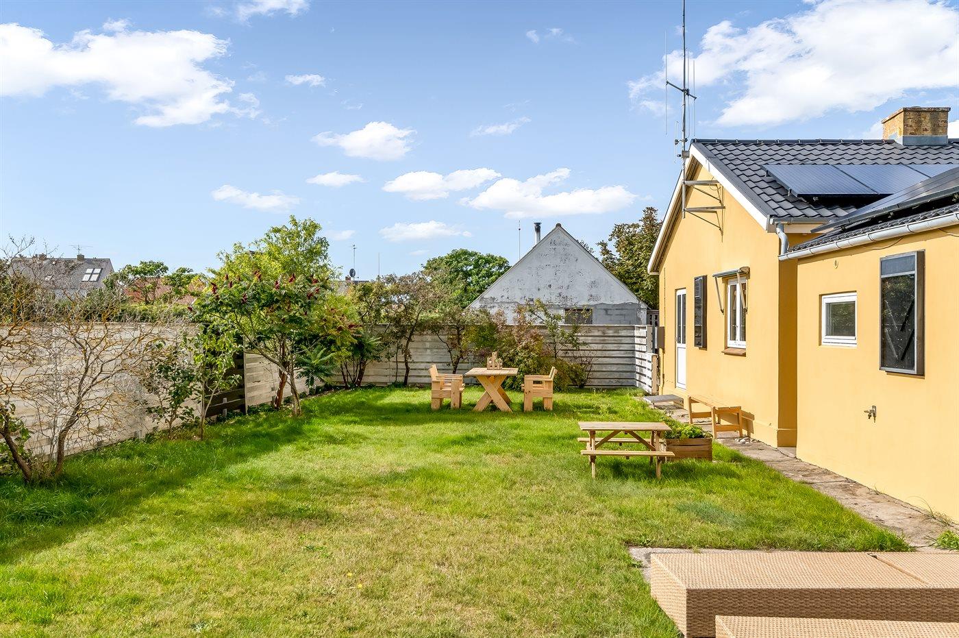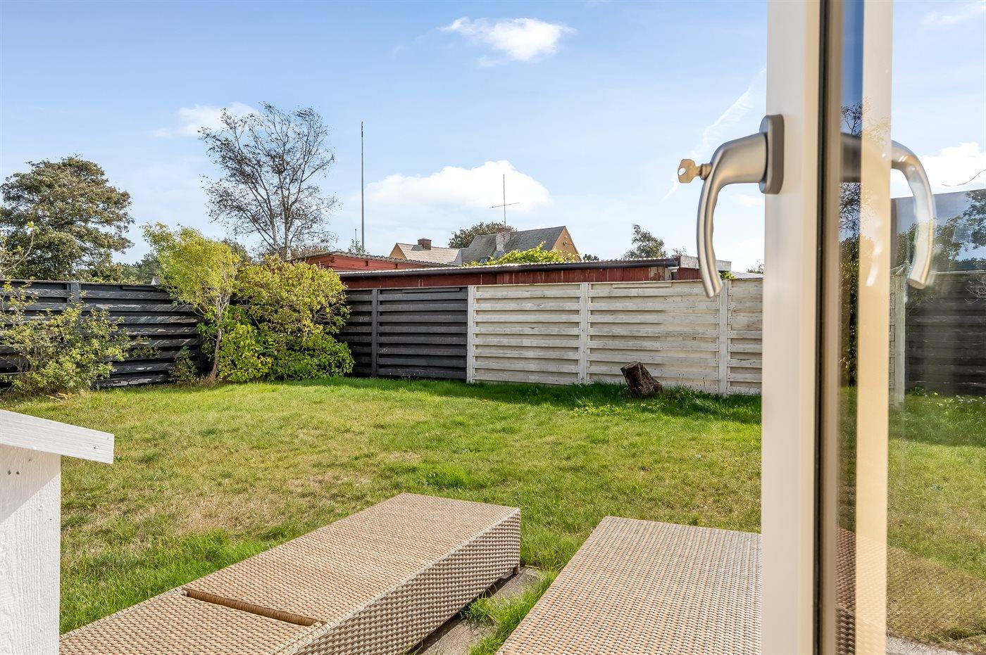 Til huset hører en hyggelig lukket terrasse i gården med markise samt en dejlig sydvendt have.
