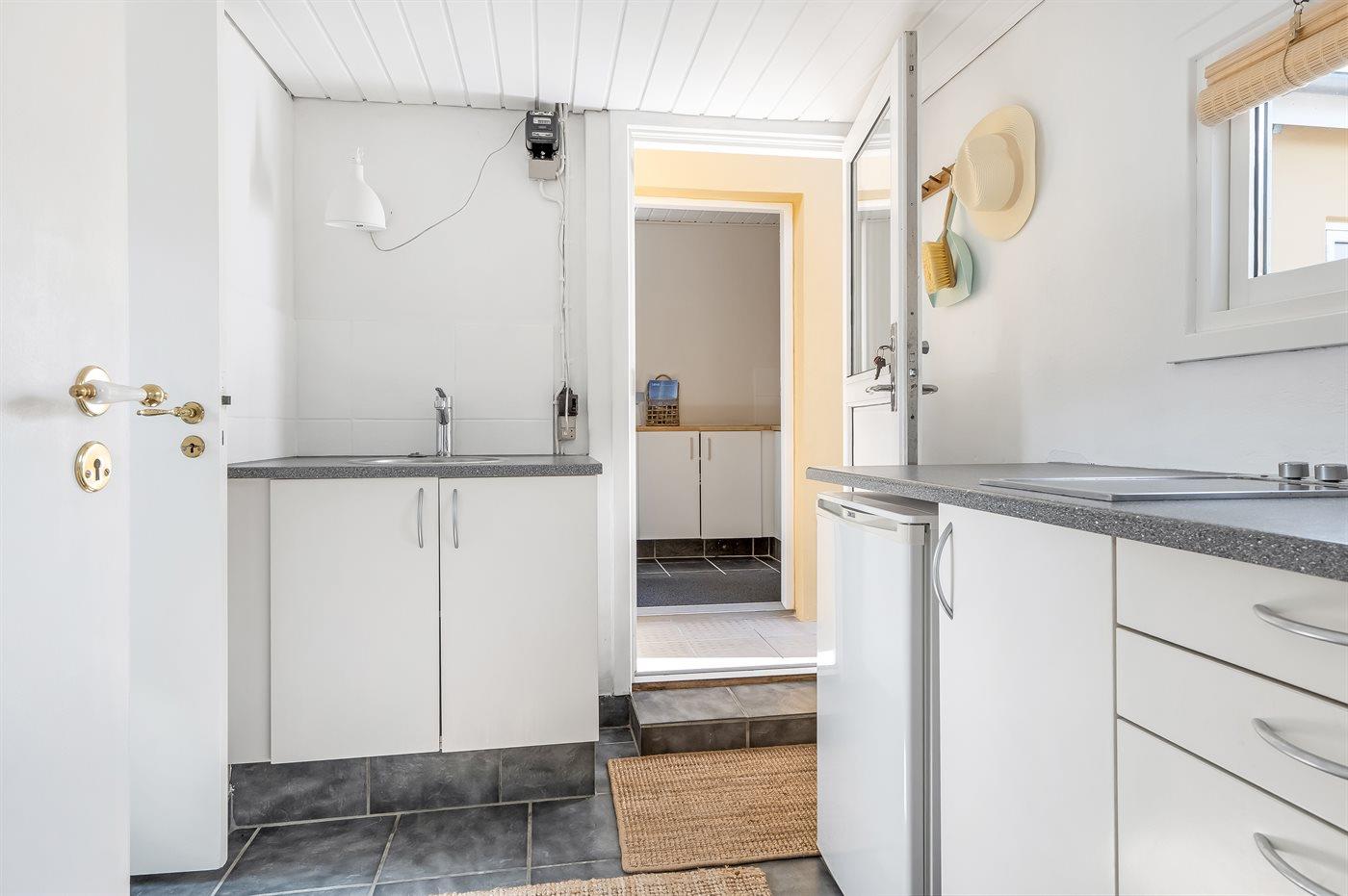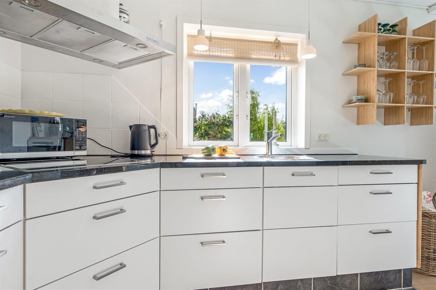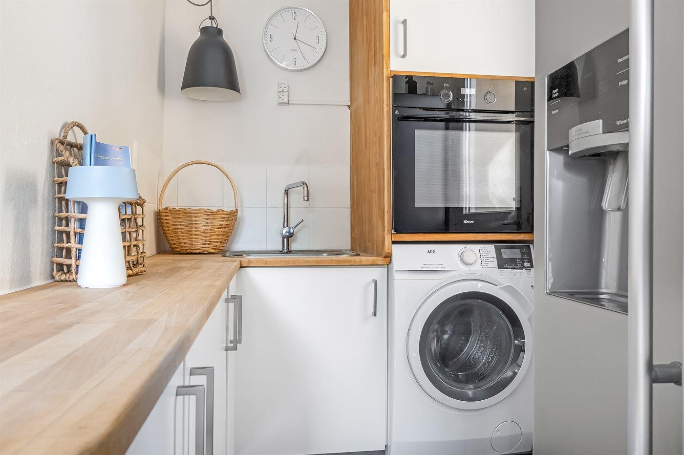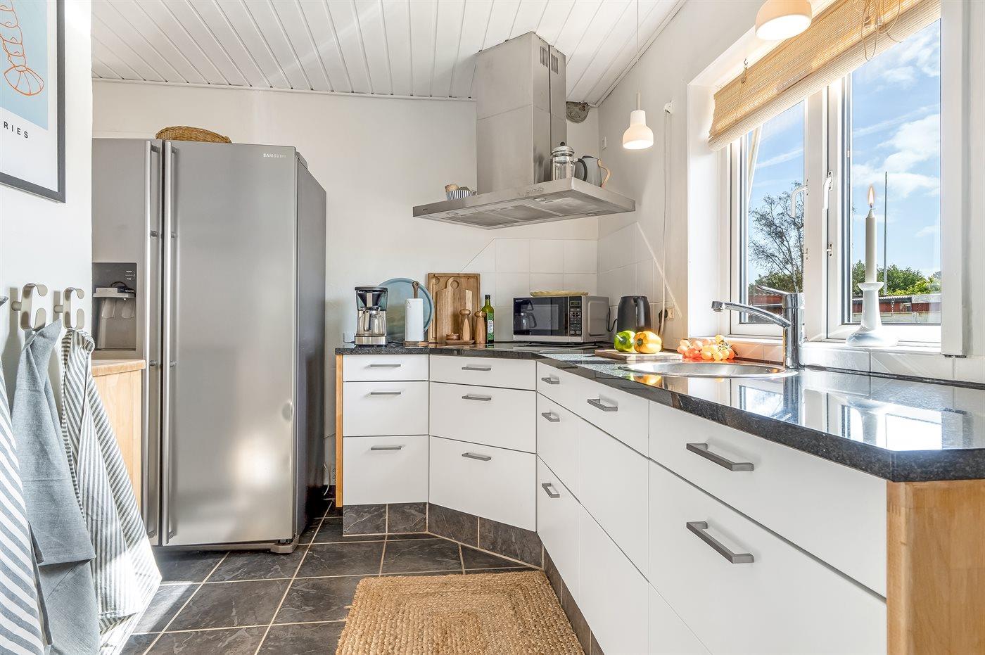 Køkkenet er udstyret med 1 amerikansk køleskab. Der er 4 induktionskogeplader, varmluftovn, mikrobølgeovn samt opvaskemaskine.