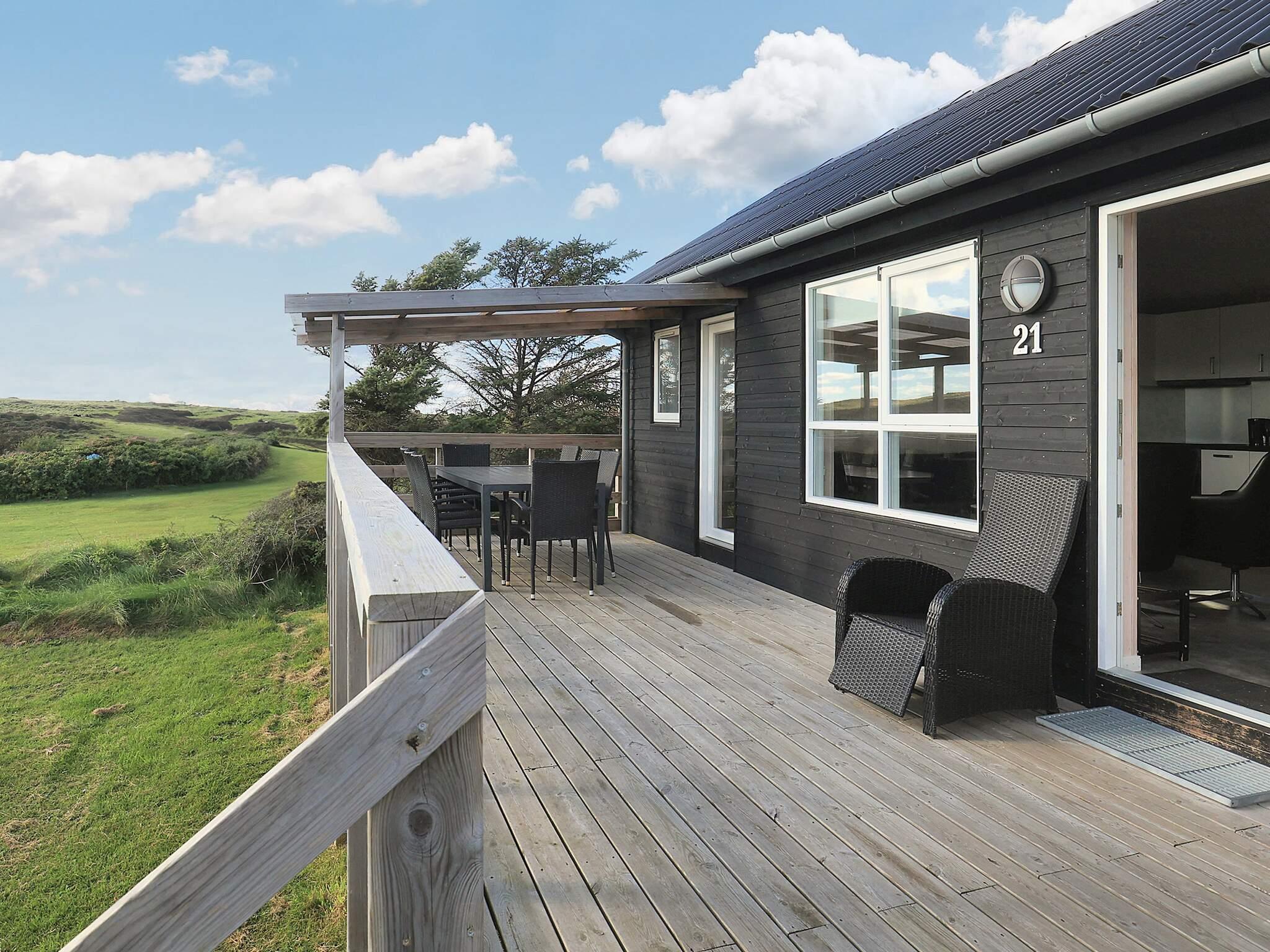 Stilfuldt og moderne feriehus i Løkken med plads til 8 personer og smuk udsigt fra den overdækkede terrasse.