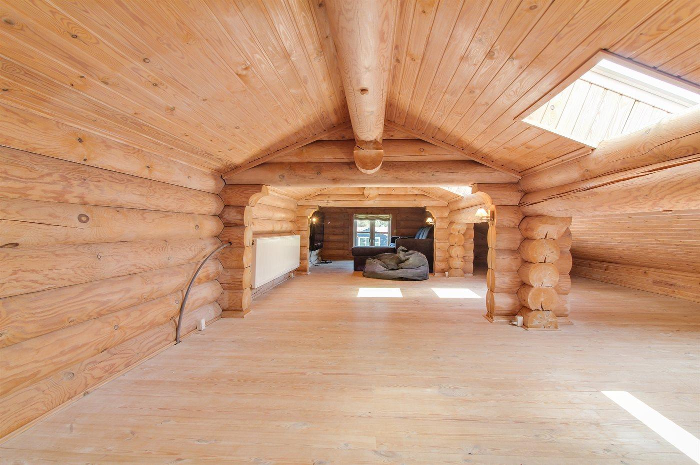 Sommerhus beliggende for enden af blind vej i roligt sommerhusområde. Huset er et flot bjælkehus med 60 m2 hems, hvor børnene kan få meget tid til at gå med at lege.