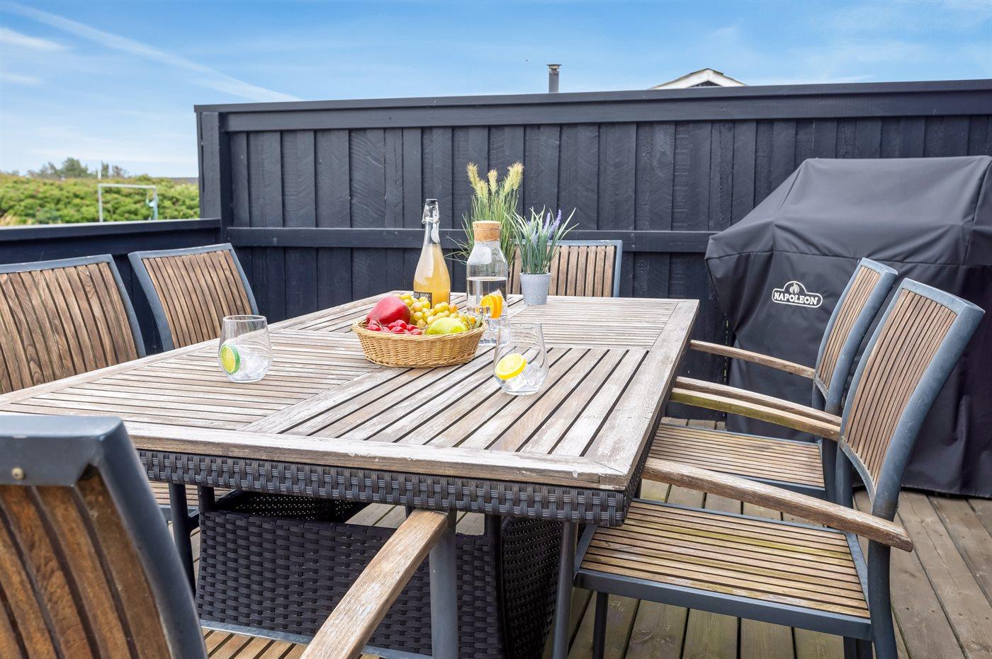 Ferieboligen er beliggende på en 2000 m² stor naturgrund. Der er 300 m til havet. Nærmeste forretning er beliggende i en afstand af 1400 m. Til ferieboligen hører åbent terrasseareal. Desuden er der overdækket terrasse. Der er redskabsrum. Grill til rådighed. Parkering ved ferieboligen.