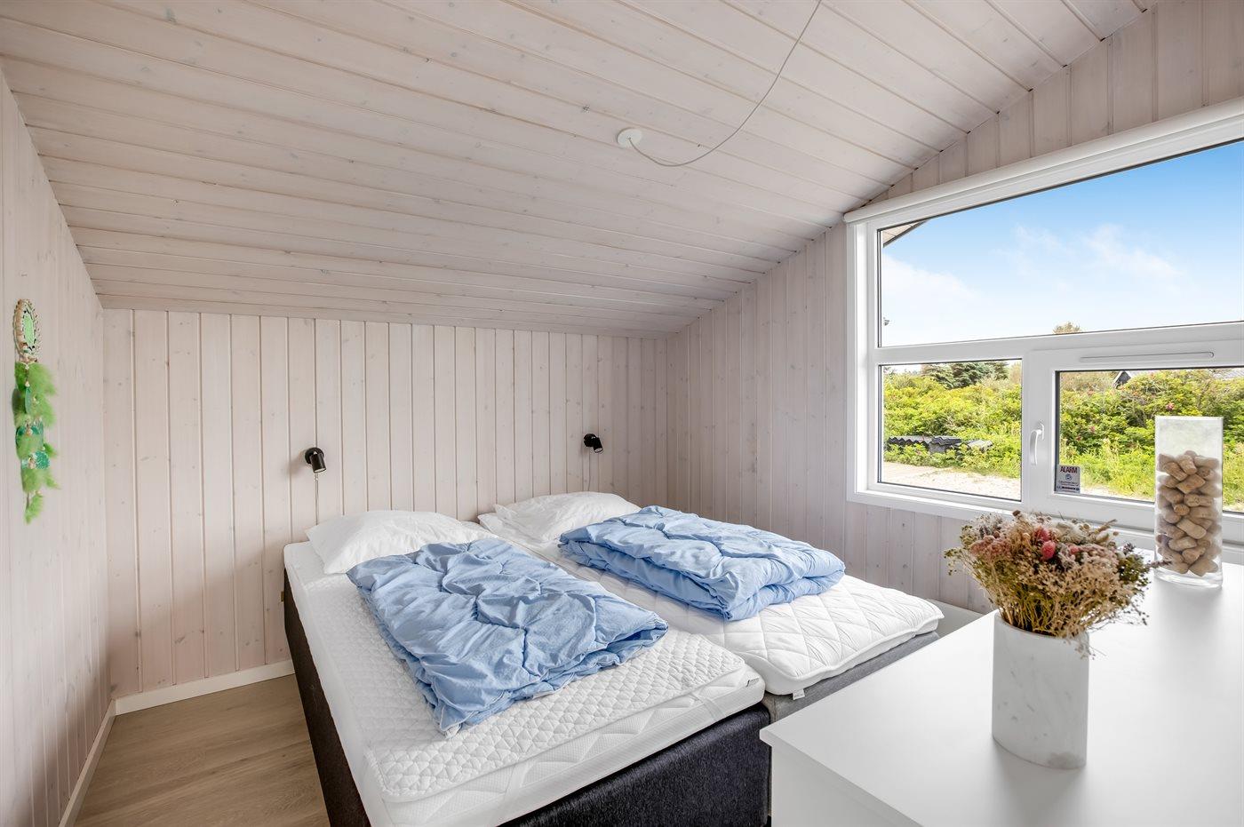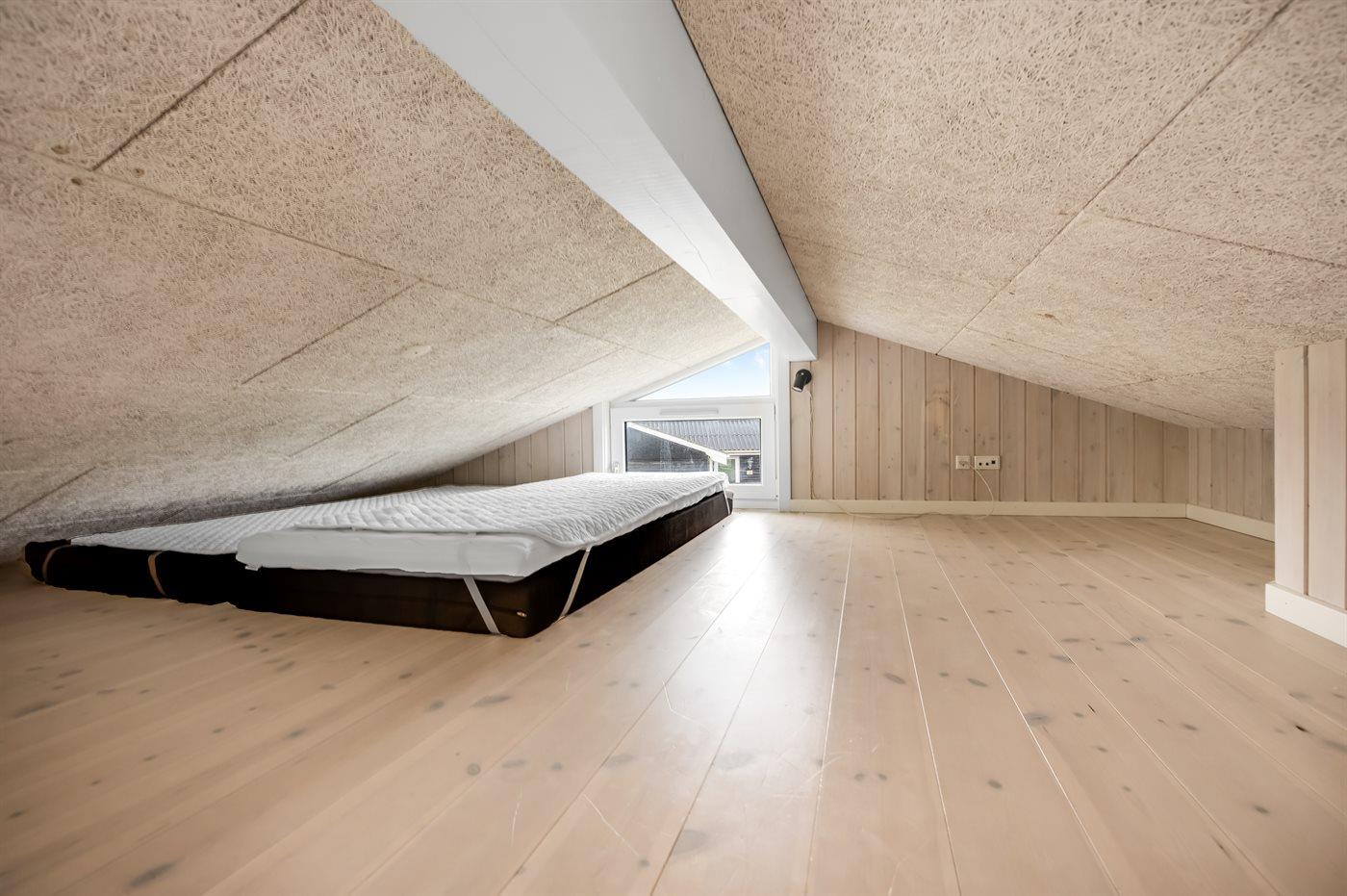 Der er i alt 4 soveværelser. Sovepladserne fordeler sig på: 6 sovepladser i dobbeltsenge. 2 sovepladser i enkeltsenge. 2 sovepladser på madrasser. 2 af disse sovepladser befinder sig på husets hems.