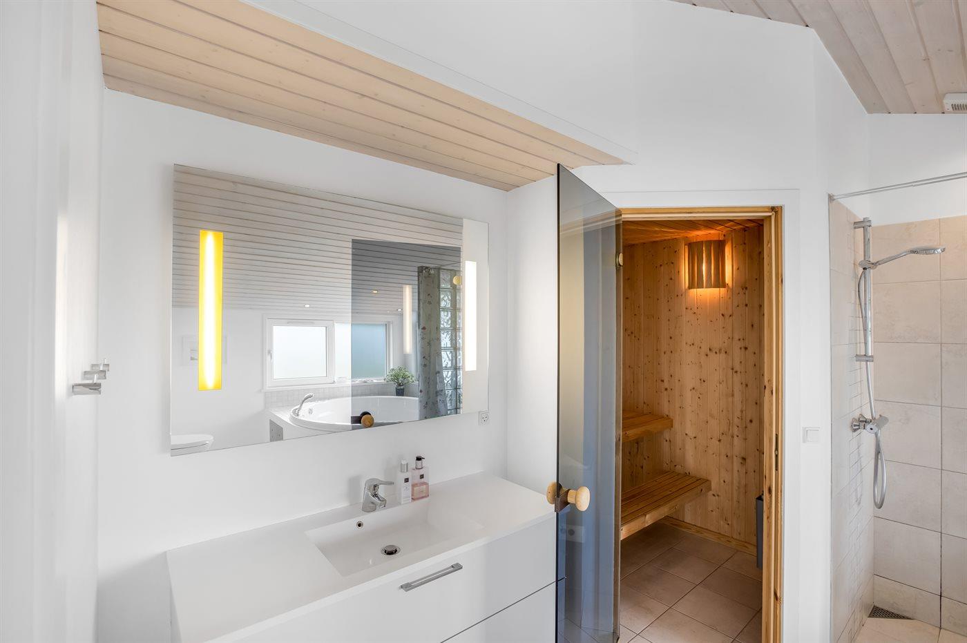 Der er 2 badeværelser med bruseniche og 2 toiletter. Der er gulvvarme på 2 badeværelser. I saunaen er der mulighed for afslapning.