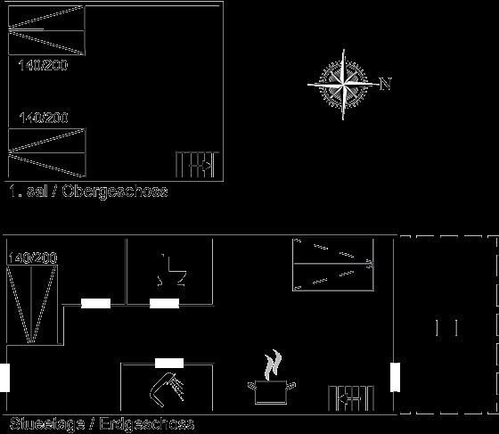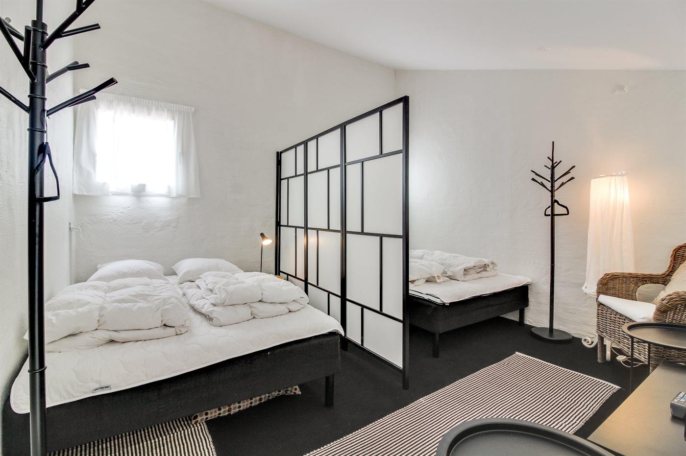 Sovepladserne fordeler sig på 2 sovepladser i dobbeltværelset i grundplan og 4 sovepladser på 1. salen, som består af to senge med plads til hver 2 personer.