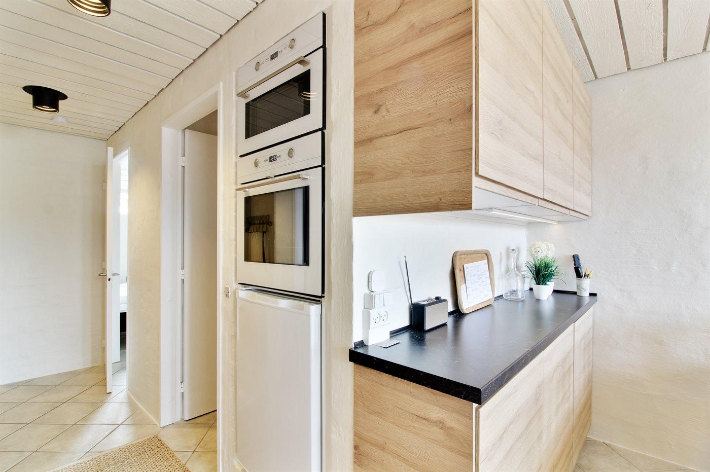 Køkkenet er udstyret med 1 køleskab. Der er 4 induktionskogeplader, varmluftovn, mikrobølgeovn samt opvaskemaskine.