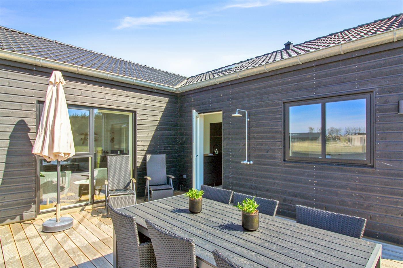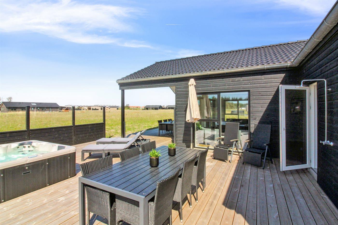 Ferieboligen er beliggende på en 595 m² stor naturgrund. Der er 950 m til havet. Nærmeste forretning er beliggende i en afstand af 800 m. Der er en golfbane i en afstand af 200 m. Til ferieboligen hører åbent terrasseareal. Desuden er der 21 m² overdækket terrasse. Gynge. Rutchebane. Udendørs bruser. Grill til rådighed. Der er carport til rådighed. Der er installeret stik til opladning af elbil. Parkering ved ferieboligen.