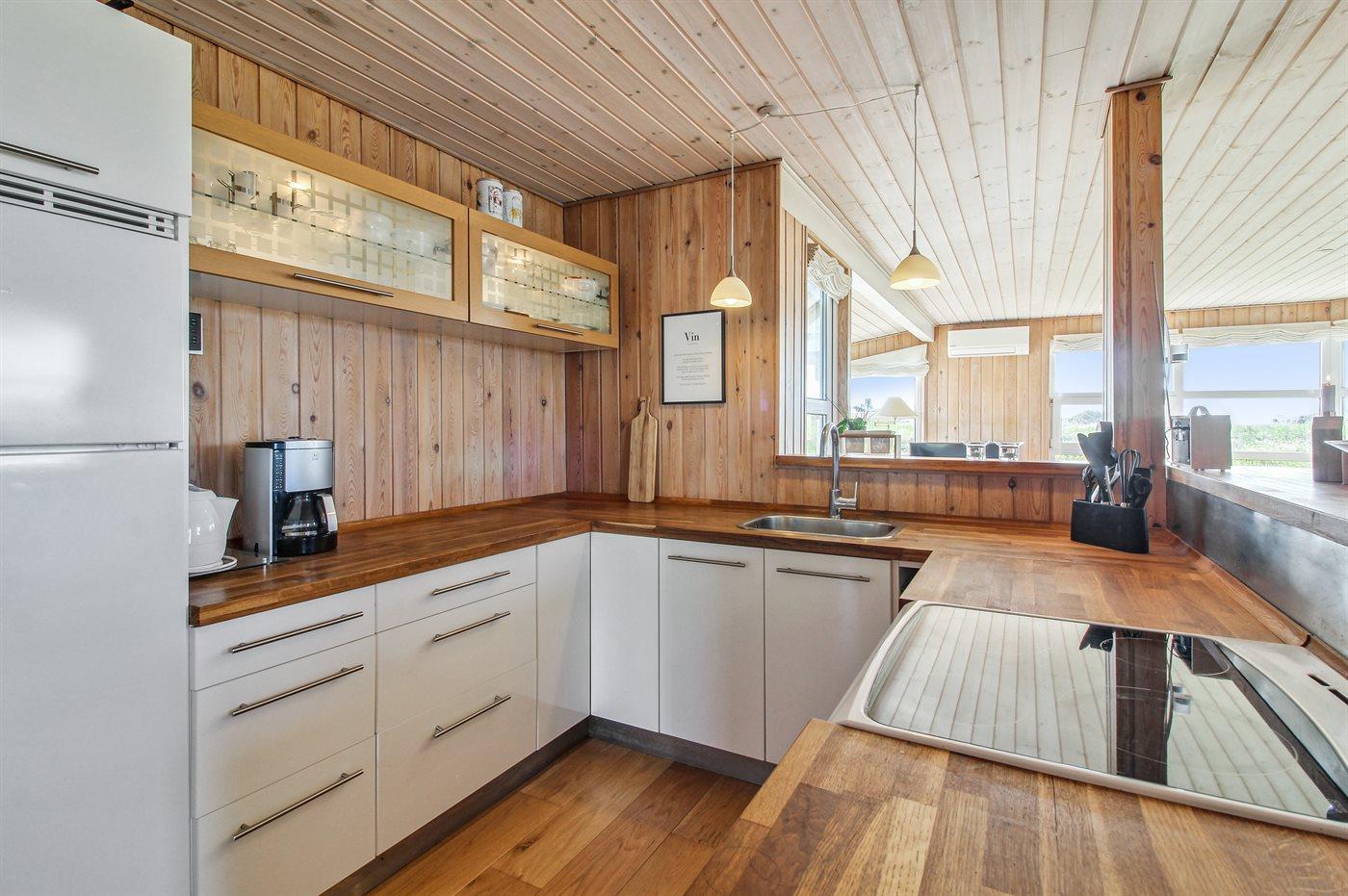 Køkkenet er udstyret med 1 køleskab. Der er 4 elkogeplader, varmluftovn, mikrobølgeovn.