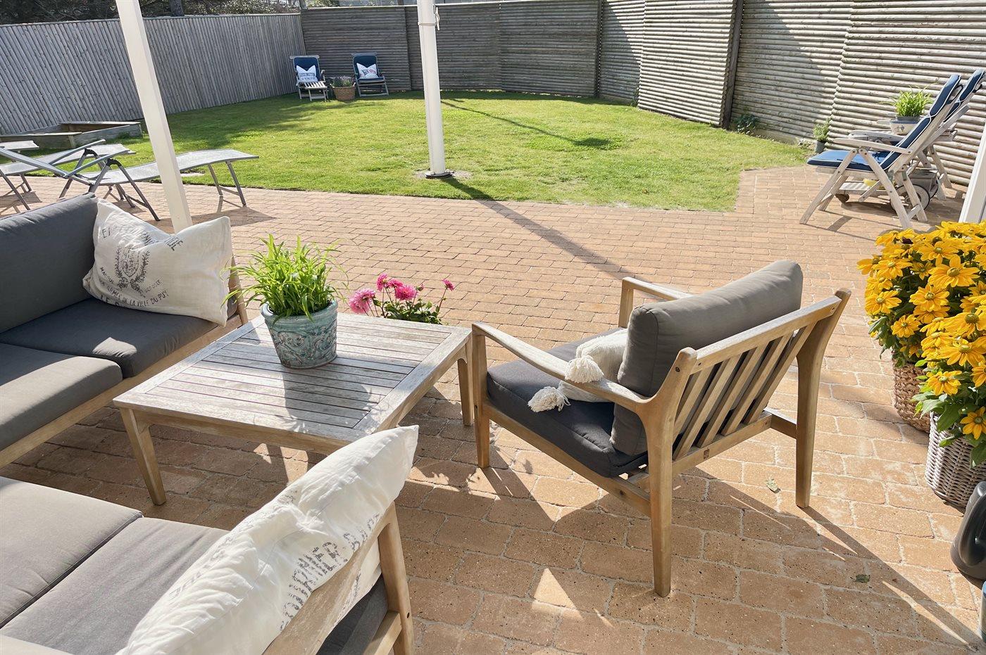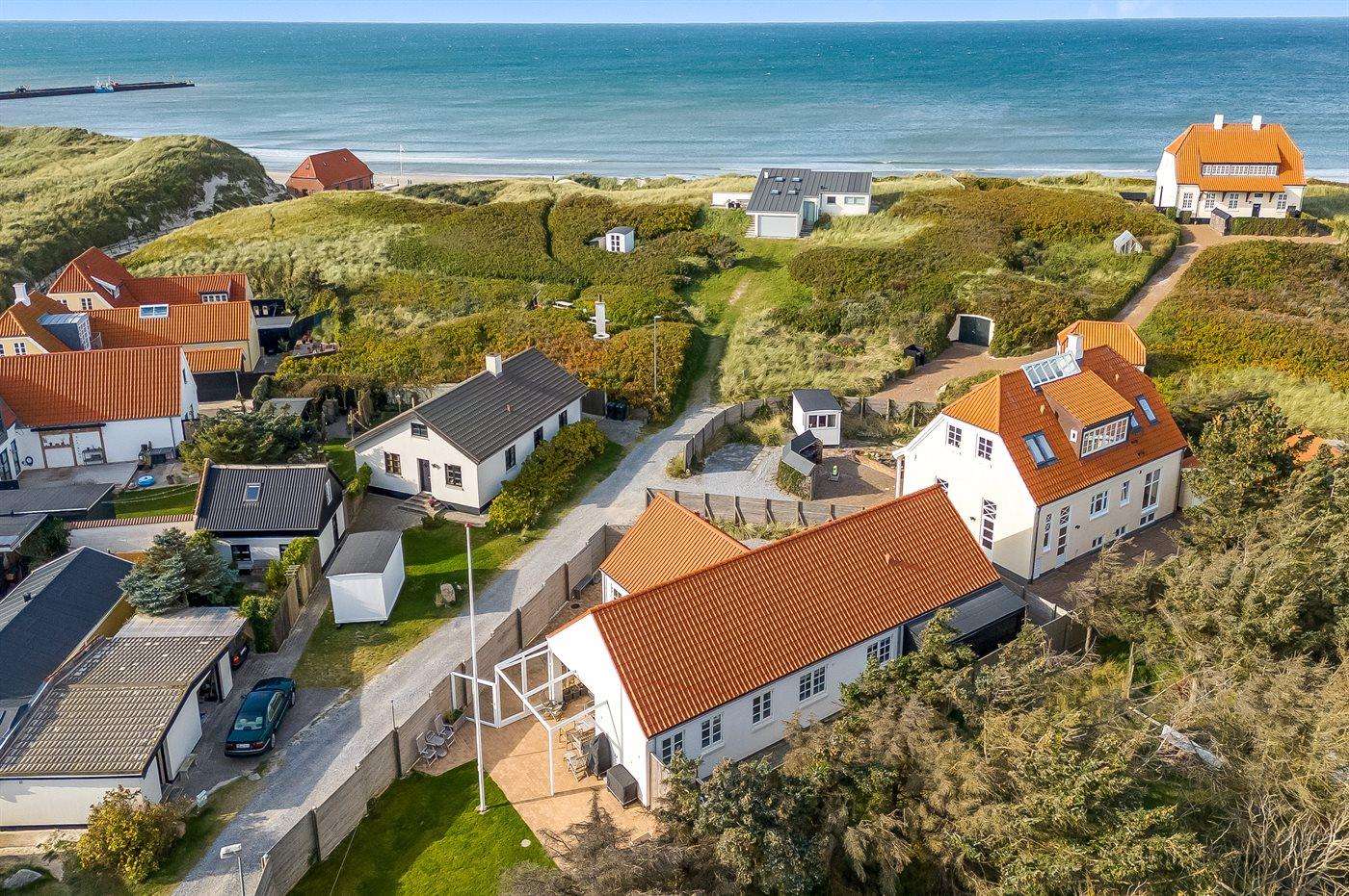 Når du har sat bilen ved ankomst til feriehuset, er det ikke nødvendigt at bruge den før afrejse. Med 3 minutters afstand til vandet og endnu kortere afstand til restaurant, behøver du ikke nogen form for transport. Huset ligger ugenert på en blind vej med kun 10 huse. Grunden er indhegnet, så det er trygt med både børn og hunde - og det er det også, når I går tur på den bilfrie strand.