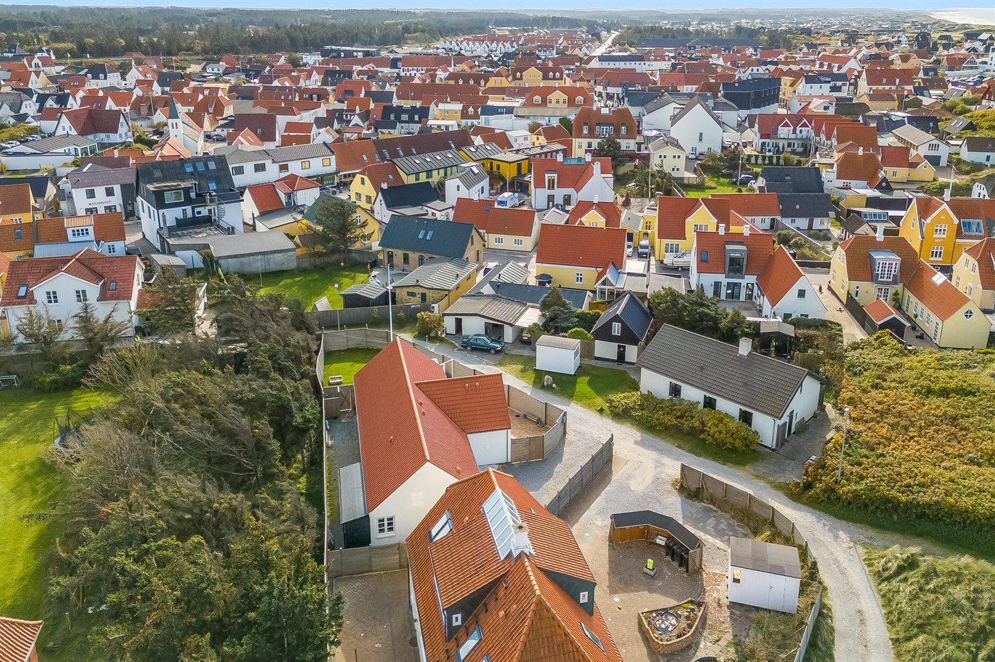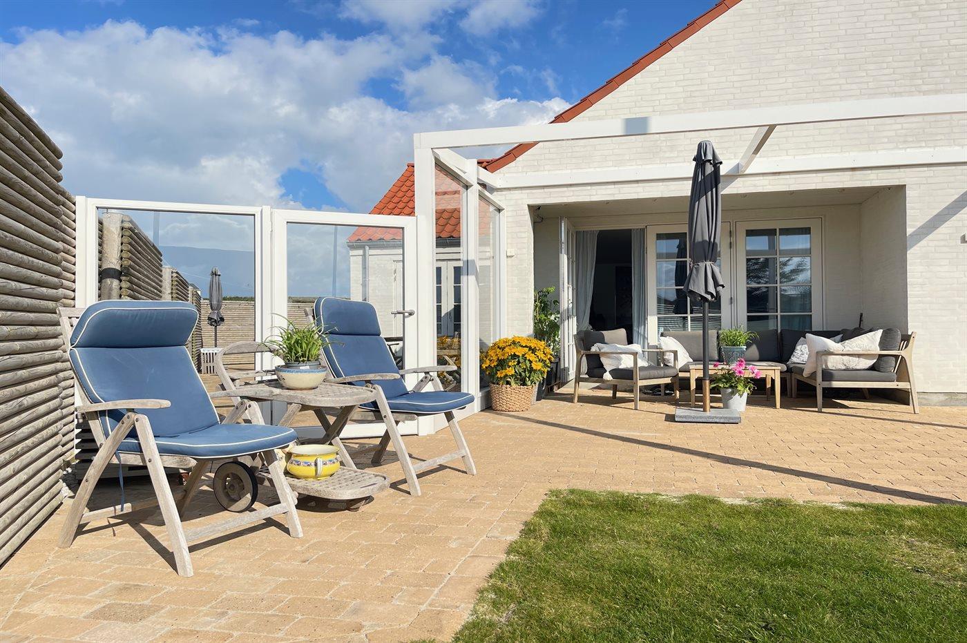 Ferieboligen er beliggende på en 600 m² stor havegrund. Grunden er indhegnet. Der er 110 m til havet. Nærmeste forretning er beliggende i en afstand af 500 m. Der er en golfbane i en afstand af 600 m. Til ferieboligen hører åbent terrasseareal. Desuden er der overdækket terrasse. Udendørs bruser. Grill til rådighed. Der er installeret stik til opladning af elbil. Type 2 stik. Parkering ved ferieboligen.