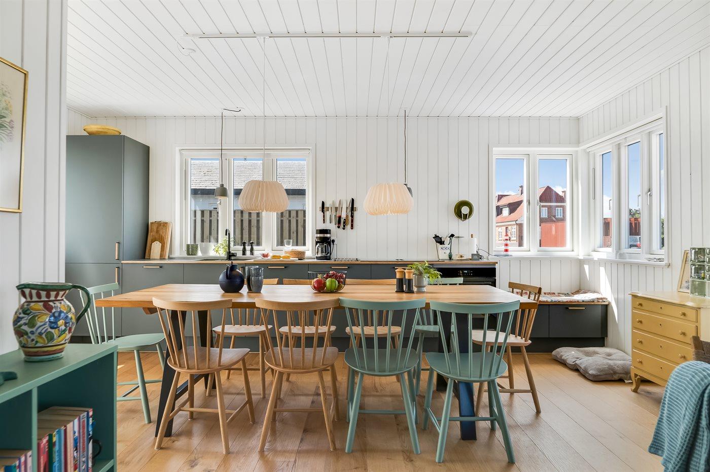 Køkkenet er udstyret med 1 køleskab. Der er 4 induktionskogeplader, varmluftovn samt opvaskemaskine.