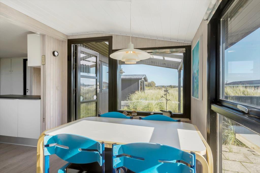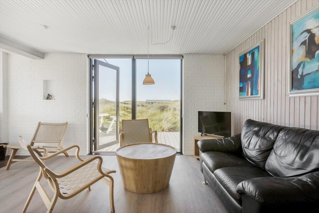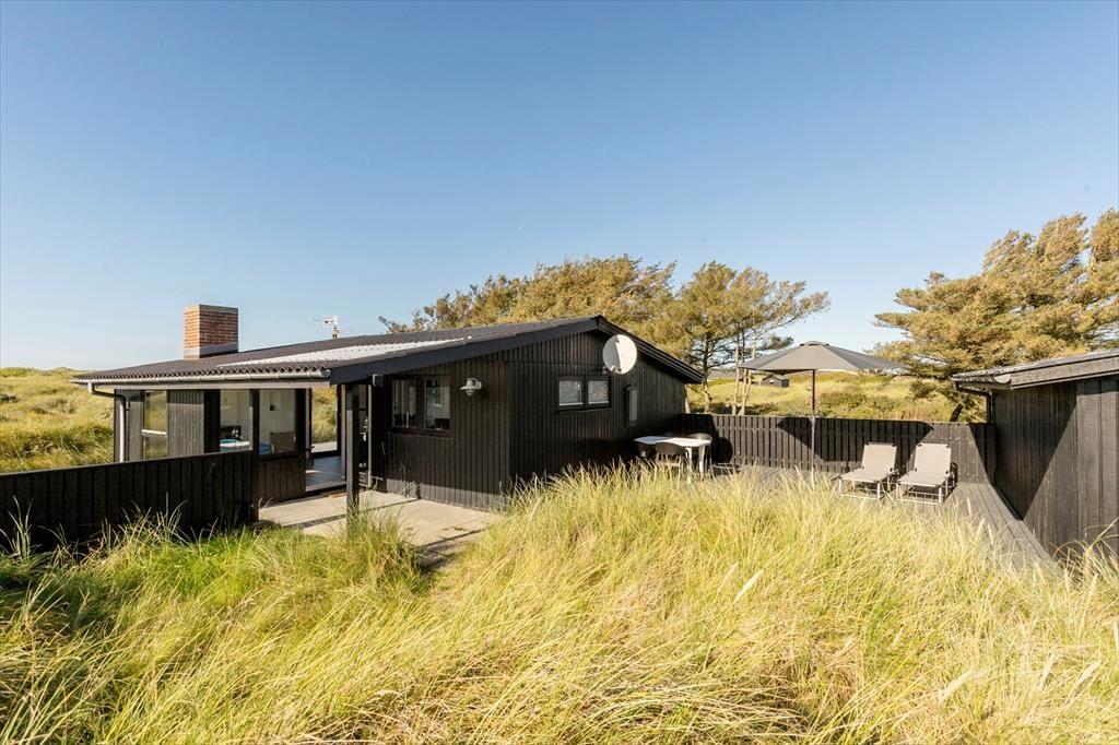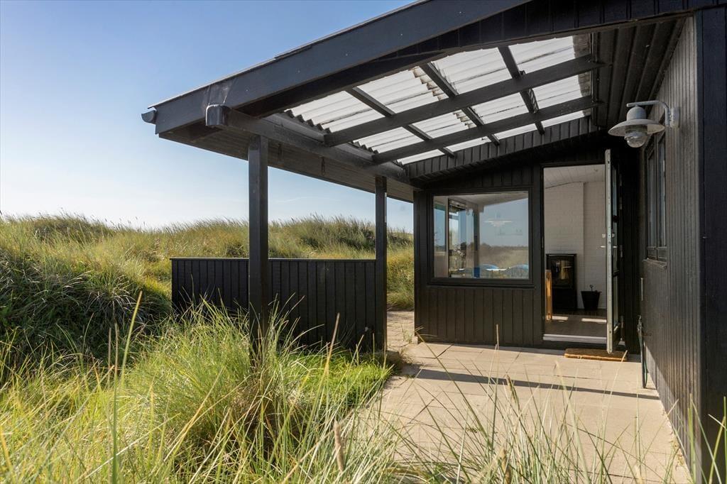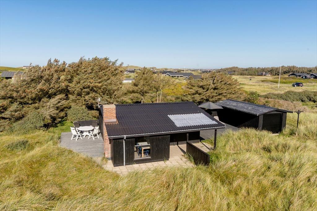 Huset er beliggende på en flot naturgrund midt i klitterne og har en dejlig udsigt over landskabet. Her er roligt, ugeneret og til Vesterhavet kan man følge en lille sti fra grunden ca. 200 meter. På begge sider af huset, er der gode terrasser og fra stuen er der udgang til en overdækket terrasse der indbyder til hyggelige grillaftener i læ for vinden. Her er havemøbler, grill og liggestole til rådighed.