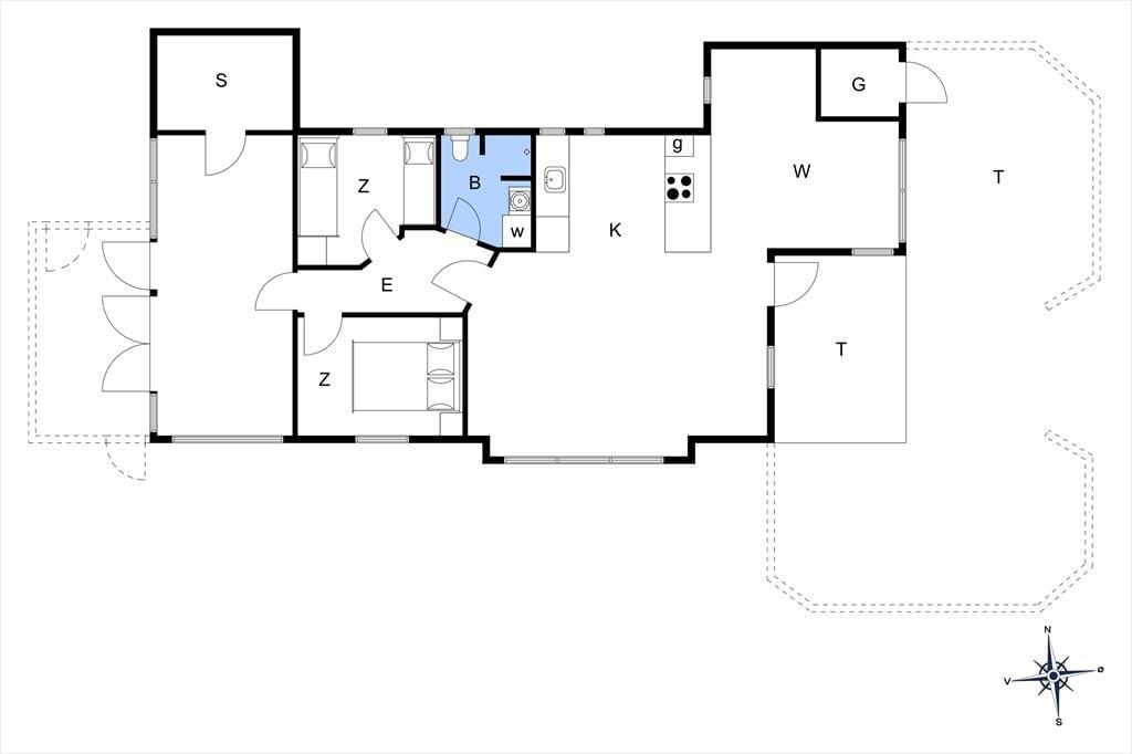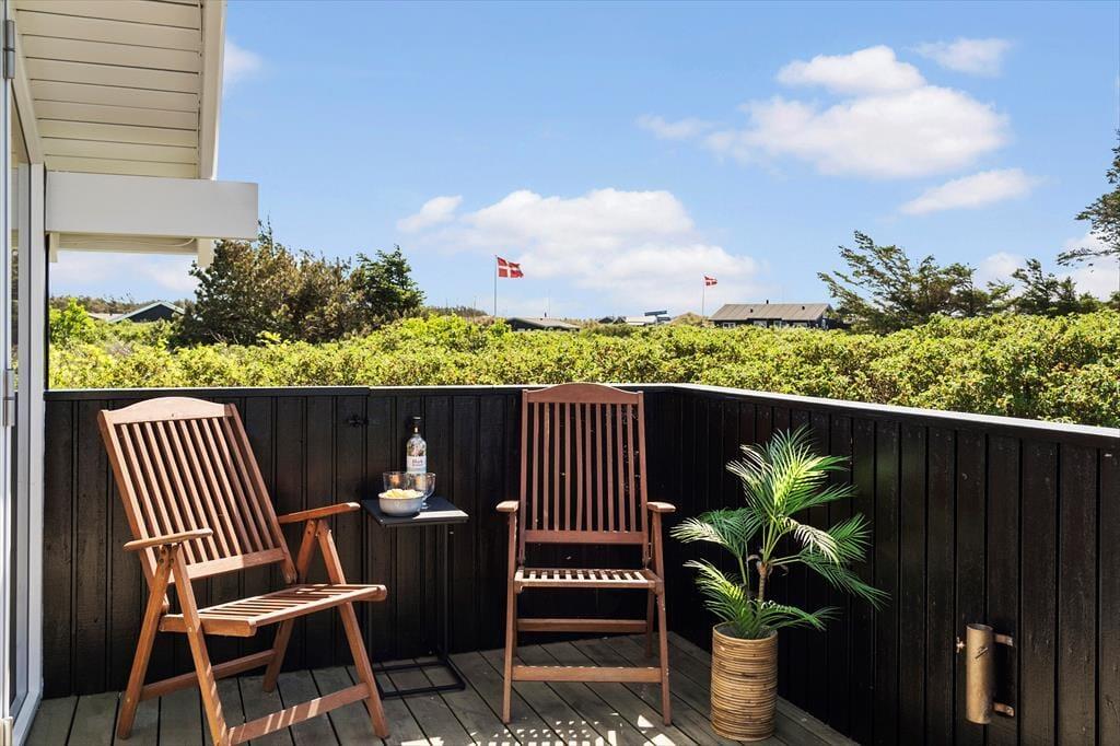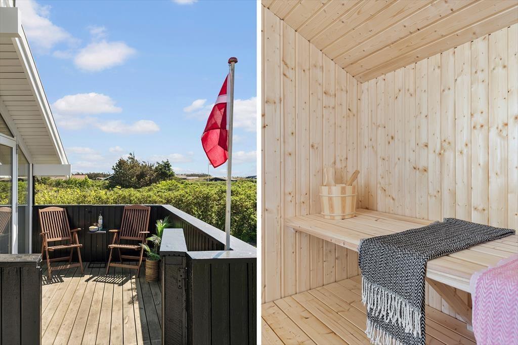 De gode terrassearealer gør det nemt at finde den helt rette opholdsplads uanset tidspunktet på dagen. Morgenens første kop kaffe vil du måske helst indtage i en solstråle på den store træterrasse, der ligger mellem huset og annekset. Med delvis afskærmning og overdækning kan du sågar finde læ for brisen og ly for en forbipasserende byge – og hvis du vil sidde i aftensol med udsigt over sommerhusområdet mod vest, kan du rykke driverlivet over på terrassen på den anden side af huset. På græsplænen mellem grundens duftende hybenbuske har du og dine kære god plads til leg og havespil, og hvis I vender hjem fra en strandtur, kan I skylle jer under den skønne udebruser.