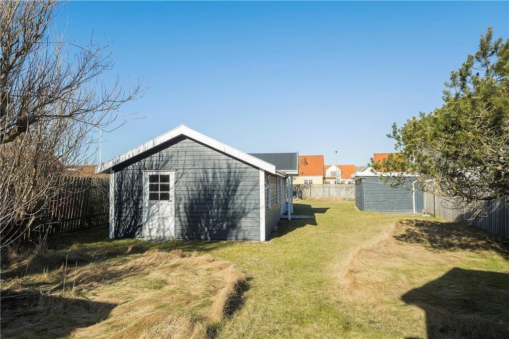 Sommerhuset ligger lidt tilbagetrukket fra vejen på en 655 m2 stor grund, der skærmes af plankeværk til alle sider. Det betyder, at haven er helt lukket og ret ugeneret, så det er et dejligt sted at sidde i en solstråle, grille og lege på græsplænen. En hyggelig opholdsplads er den overdækkede terrasse, hvor I kan blive siddende til langt ud på aftenen, mens mørket sænker sig over Løkken.