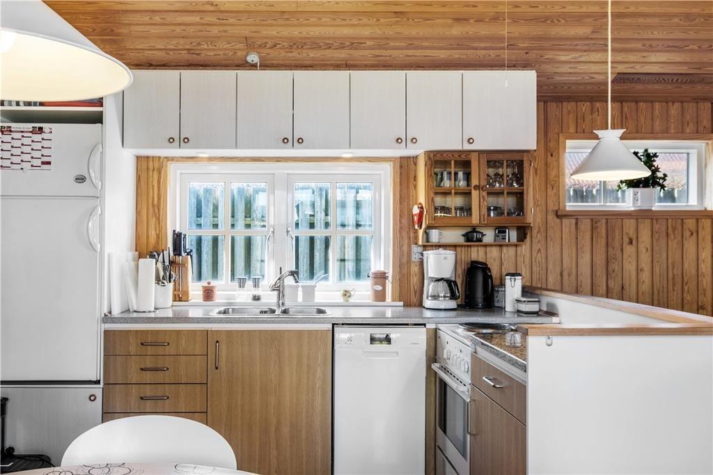 Inden døre har I 54 m2 at gøre godt med, så sommerhuset er altså ikke et af de største på markedet. Men hvem har også brug for mange kvadratmeter, når rammerne er så charmerende, og I under alle omstændigheder gerne vil bruge en stor del af tiden sammen? I den ene ende af sommerhuset ligger to soveværelser, et vaskerum, et toilet og en separat brusekabine, mens en dejlig stue med integreret køkken udgør den anden halvdel. Med trælister på væggene, loft til kip og sprossevinduer emmer huset af vaskeægte sommerhusatmosfære, og møblementet er med til at understrege den hyggelige fornemmelse.