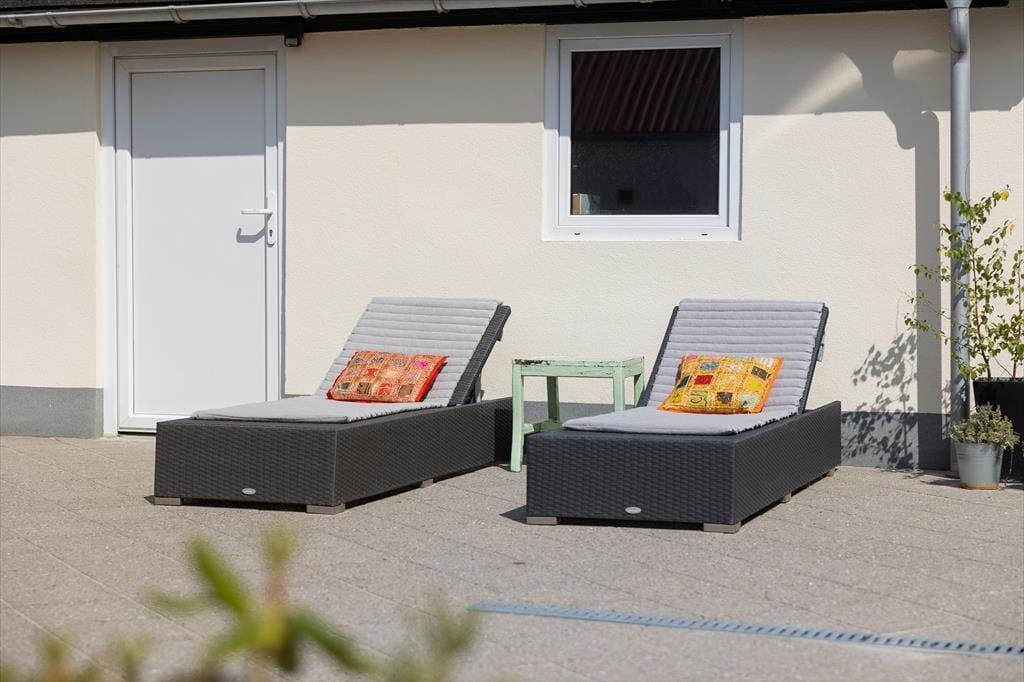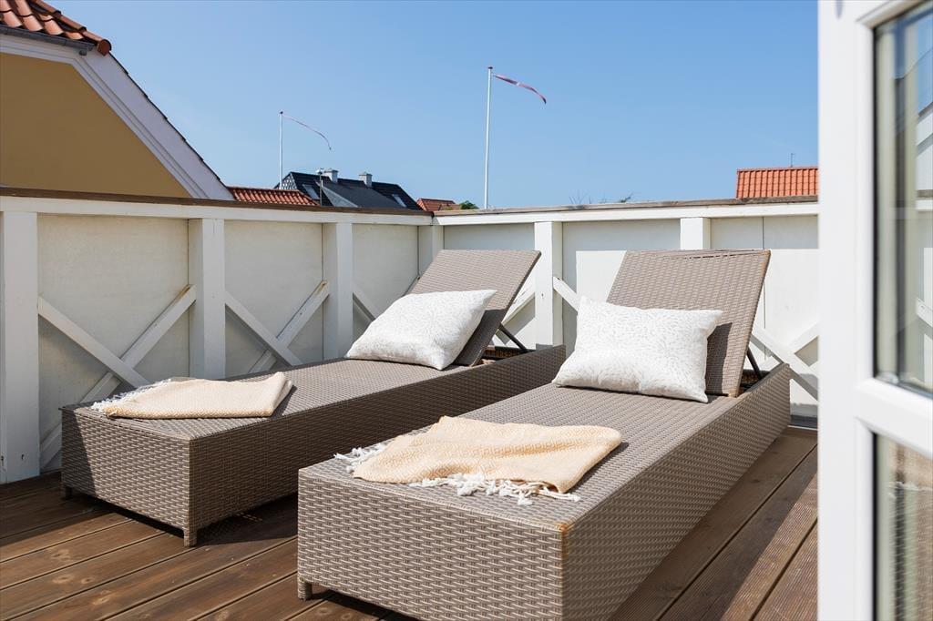 En skøn gårdhave bag huset giver jer en dejlig ramme om ferieturens hyggelige udendørs stunder. Her får I jeres helt private oase midt i byen, hvor I kan tilbringe lange dasedage eller bare tage en pause fra badeture og restaurantbesøg i byen. Vil I også have udsigten med, kan I trække op på førstesalen, hvor I finder en fin terrasse med aftensol og kig over hustagene.