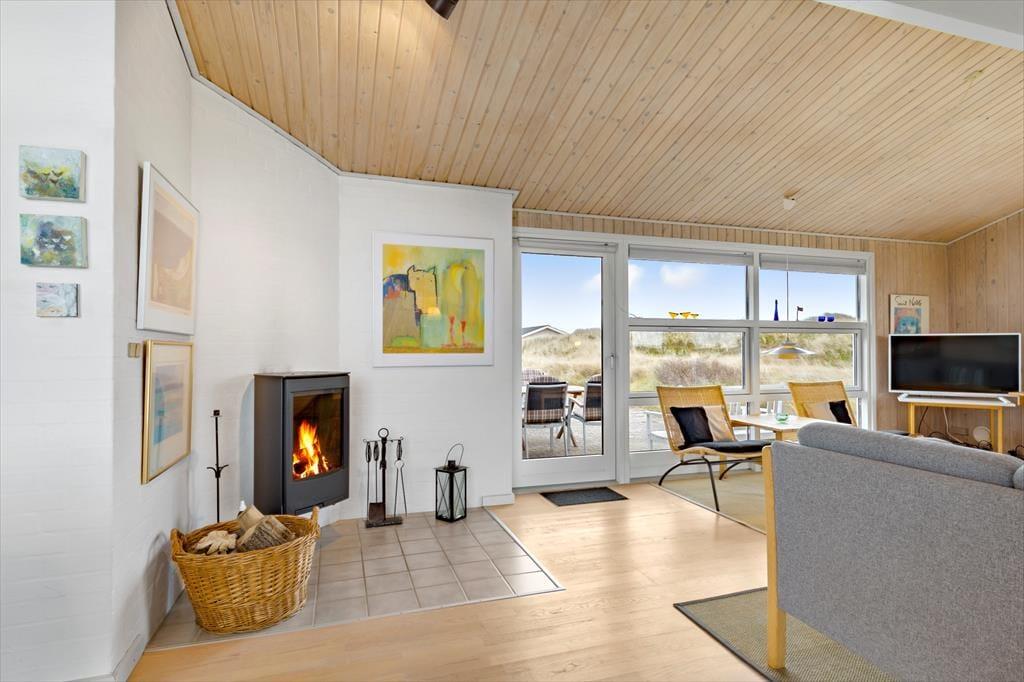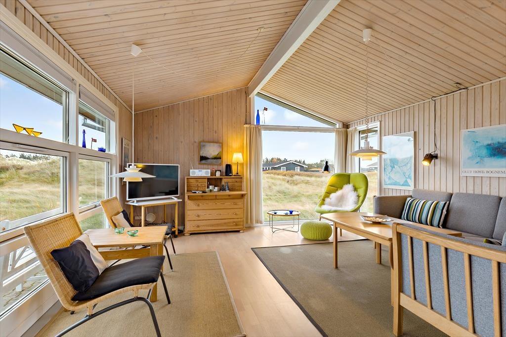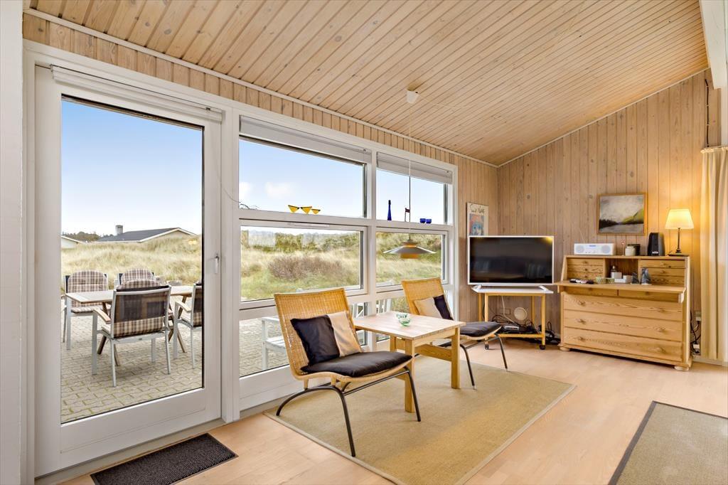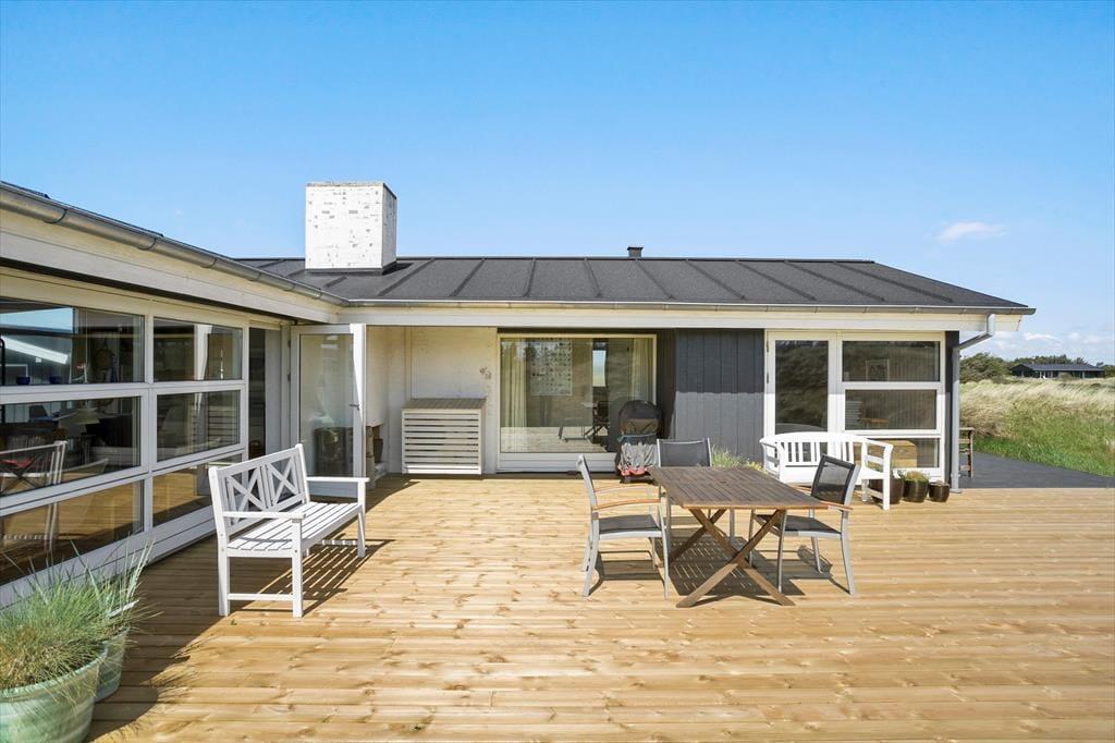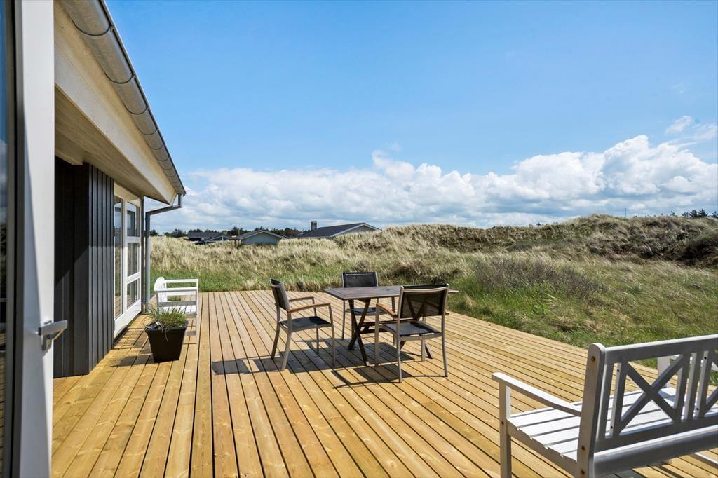 Gennem sommerhusets vinduer har I udsigt til bølgende marehalm og klitter, og det flotte syn bliver bestemt ikke ringere, når I flytter driverlivet ud i det fri. Her kan I sætte jer på det syd- og østvendte terrassemiljø, der er udstyret med alt, hvad I skal bruge af havemøbler, liggestole, grill og parasol. På den store klitgrund står der for øvrigt en carport til bilen.