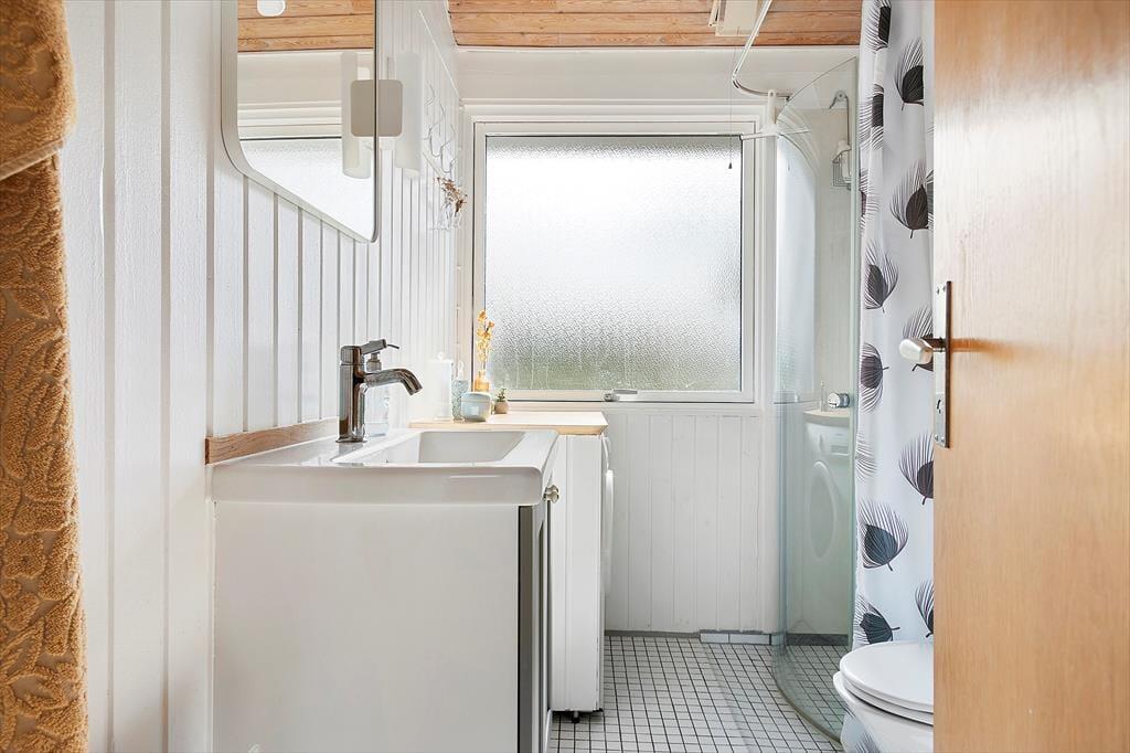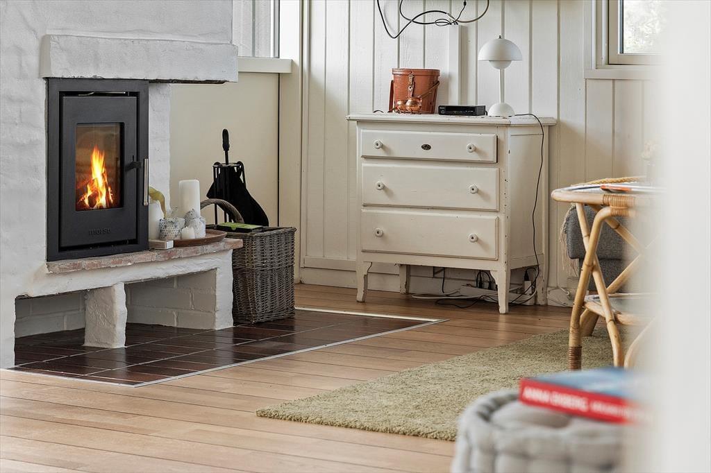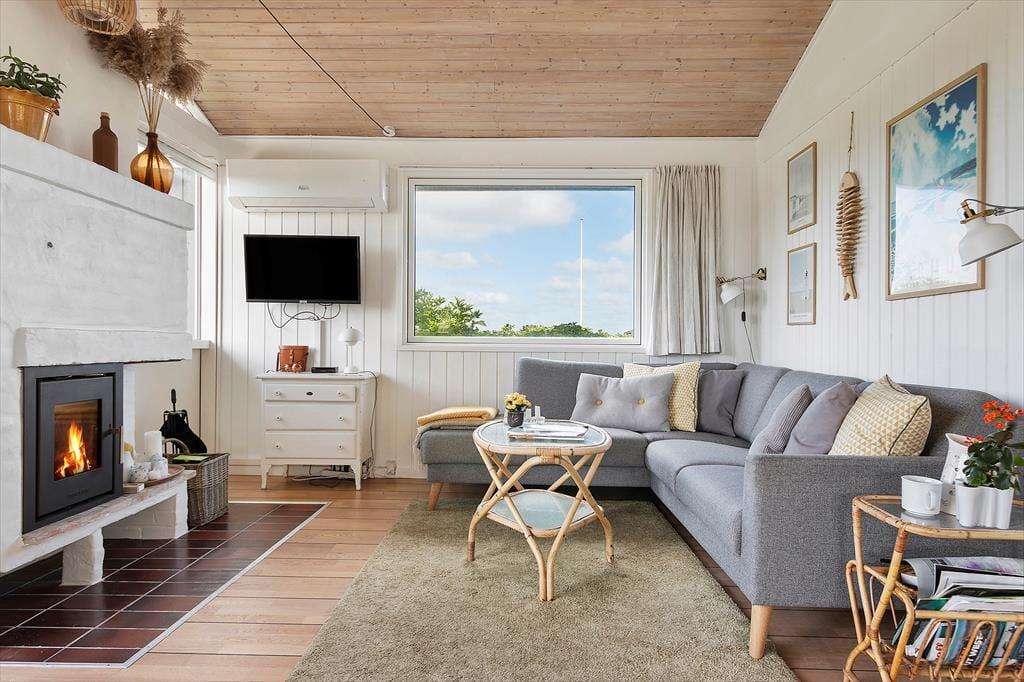 Efter seneste istandsættelse er farvetonerne lyse inden døre, og man har fundet en skøn balance mellem moderne møblement og retro elementer, der bidrager til den helt rette sommerhusstemning. I stuen kan I tilmed tænde op i pejsen, når I vil hygge jer med en god bog eller krydsogtværs i sofaen – bare husk at kigge op engang imellem, så I kan nyde udsigten over det åbne landskab, der breder sig udenfor stuevinduerne. Et funktionelt indrettet køkken ligger i forlængelse af stuen, og derudover består planløsningen af tre gode soveværelser og et badeværelse med bruser.