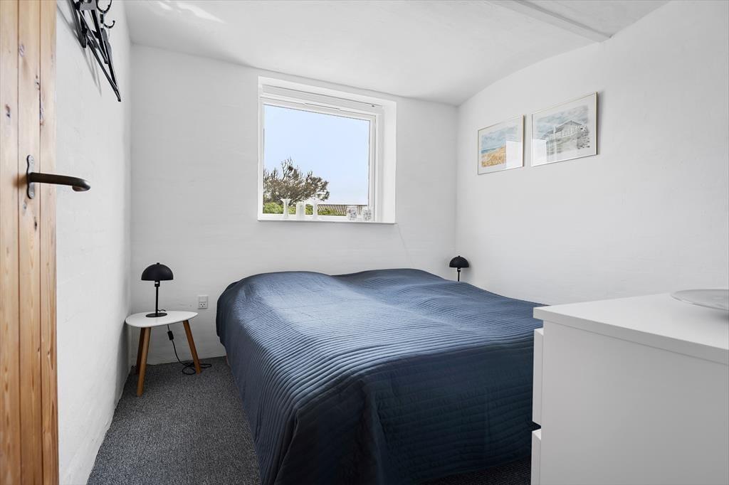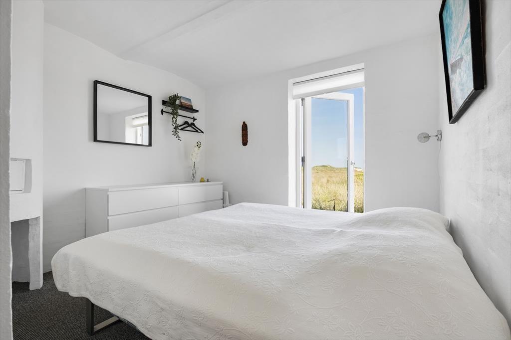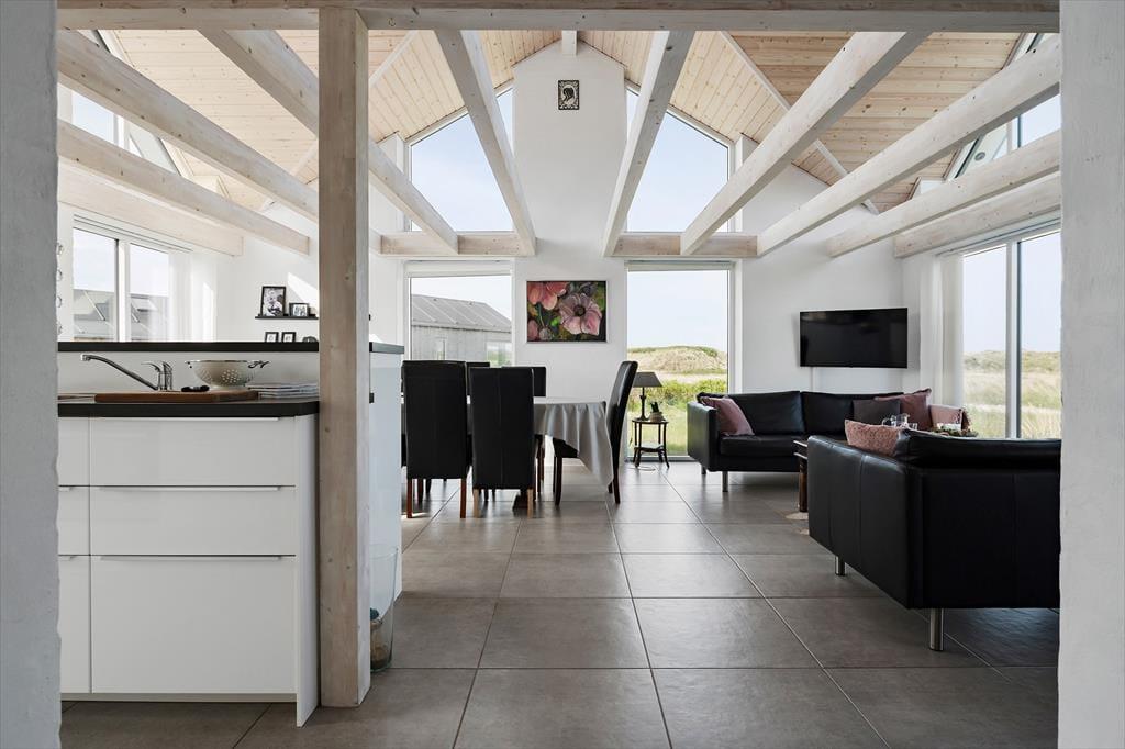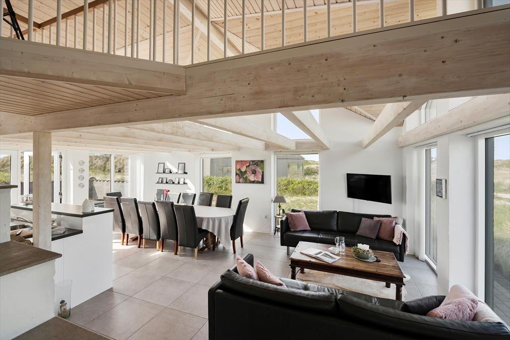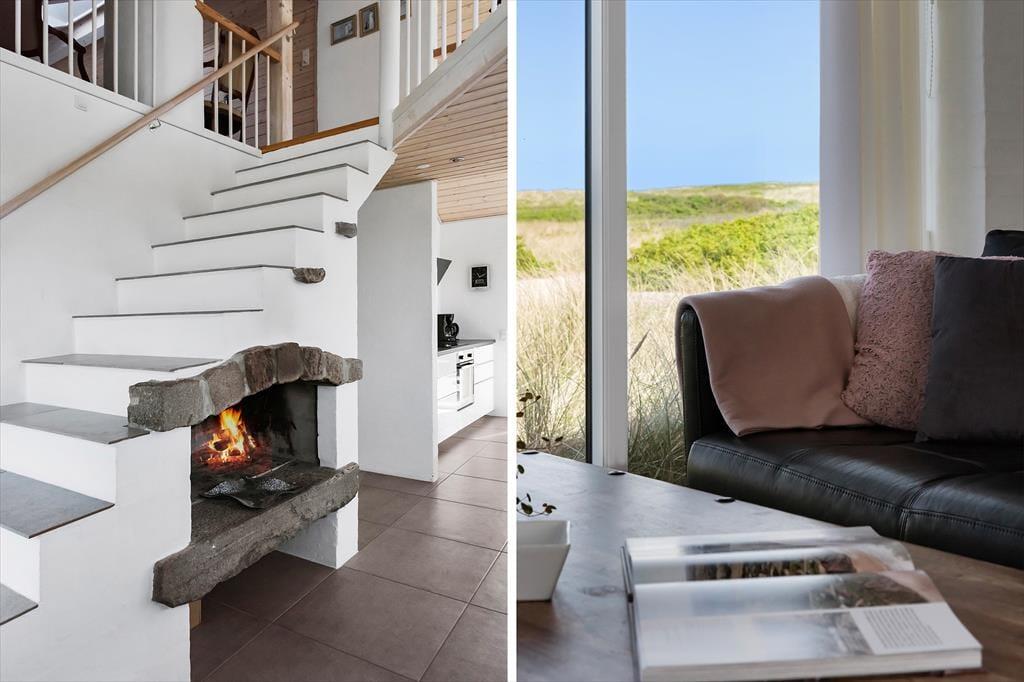 Beliggenheden i første klitrække er helt klart værd at nævne som noget af det første – men også sommerhusets lyse atmosfære og den rummelige planløsning bør fremhæves. Inden døre er der nemlig en flot loftshøjde og store vinduespartier, der inviterer solen og klitomgivelserne indenfor, og med hele 127 m2 har I masser af plads til at folde ferielivet ud. Tre soveværelser, et badeværelse og et bryggers ligger samlet i en velproportioneret afdeling, mens et fjerde soveværelse og et gæstetoilet ligger separat i et anneks med egen indgang. Sommerhusets veludstyrede køkken er integreret med en stor og stilfuld pejsestue, og herfra går der en trappe op til en stor hems, der oplagt kan bruges til en rolig læsestund, en siesta, børnenes leg eller eventuelt overnatning.