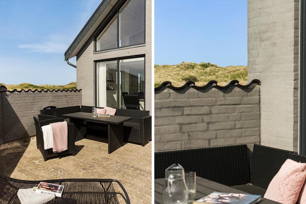 På den 1004 m2 store klitgrund har I rig mulighed for at nyde kystens smukke lys, den salte luft og solens varmende stråler, når I slapper af på terrassen. Den er orienteret mod syd og er helt aflukket af murværk, og med havemøbler, liggestole, grill og parasol er der lagt op til mange skønne stunder både morgen, middag og aften.