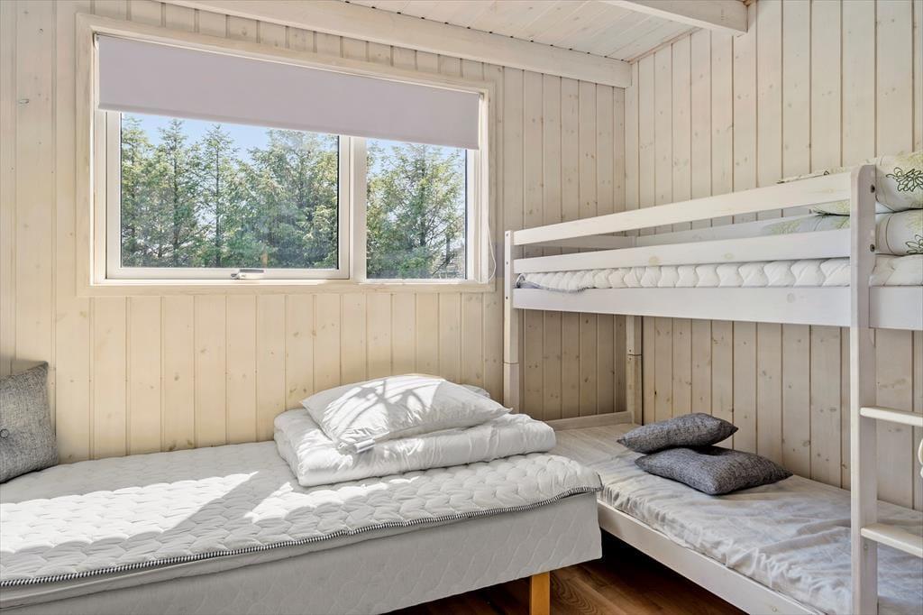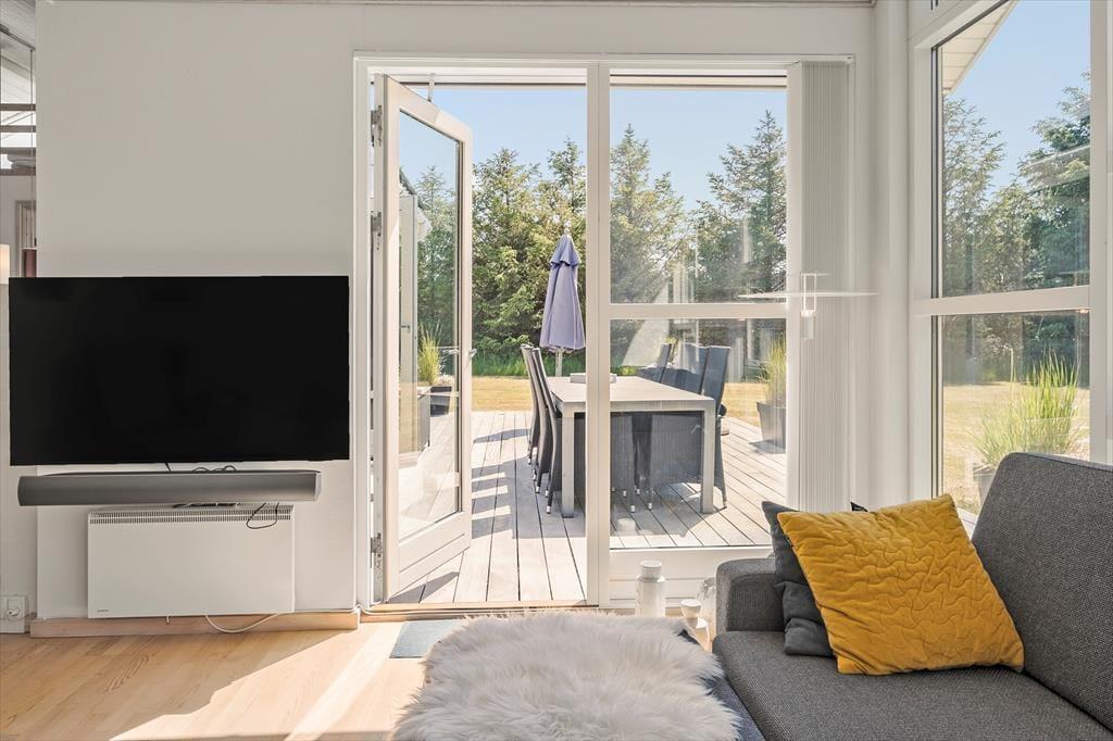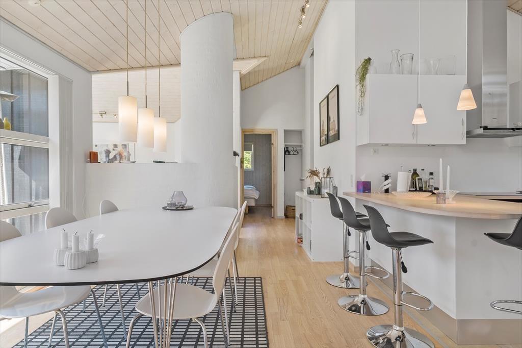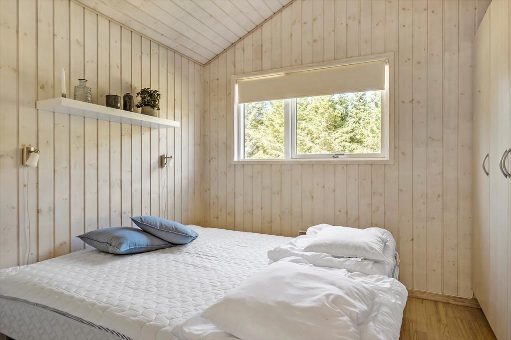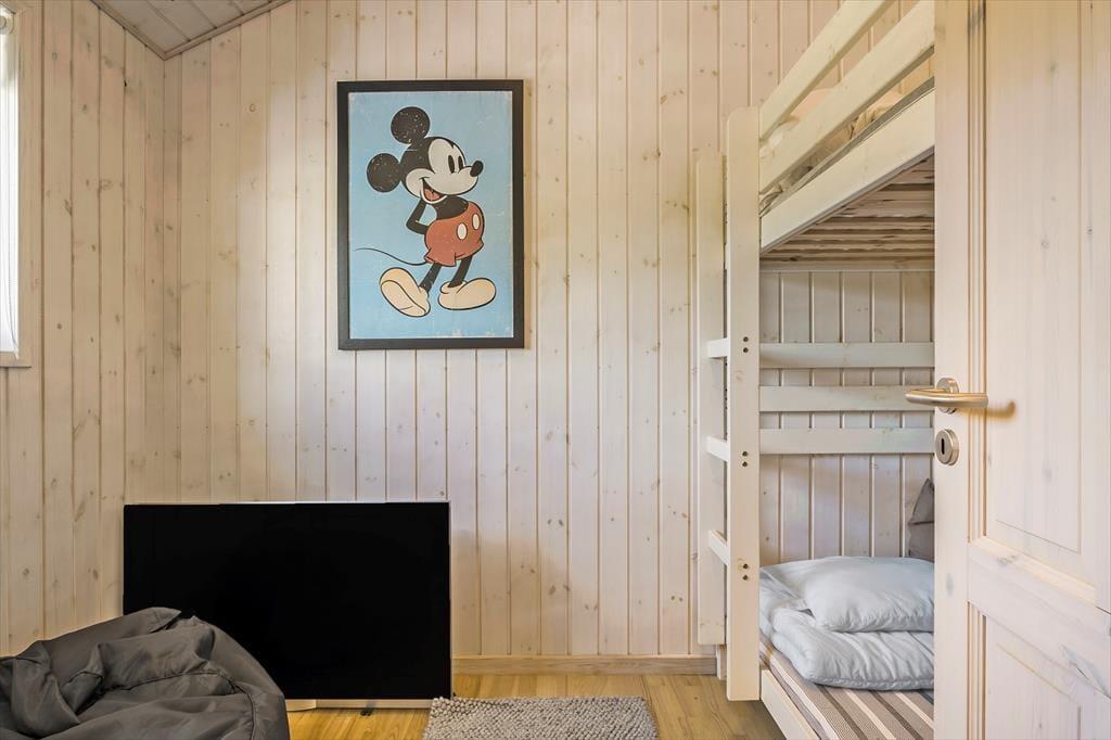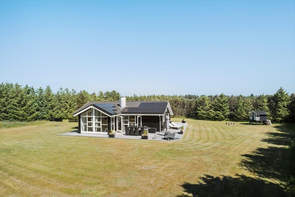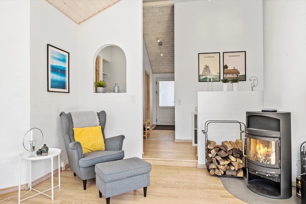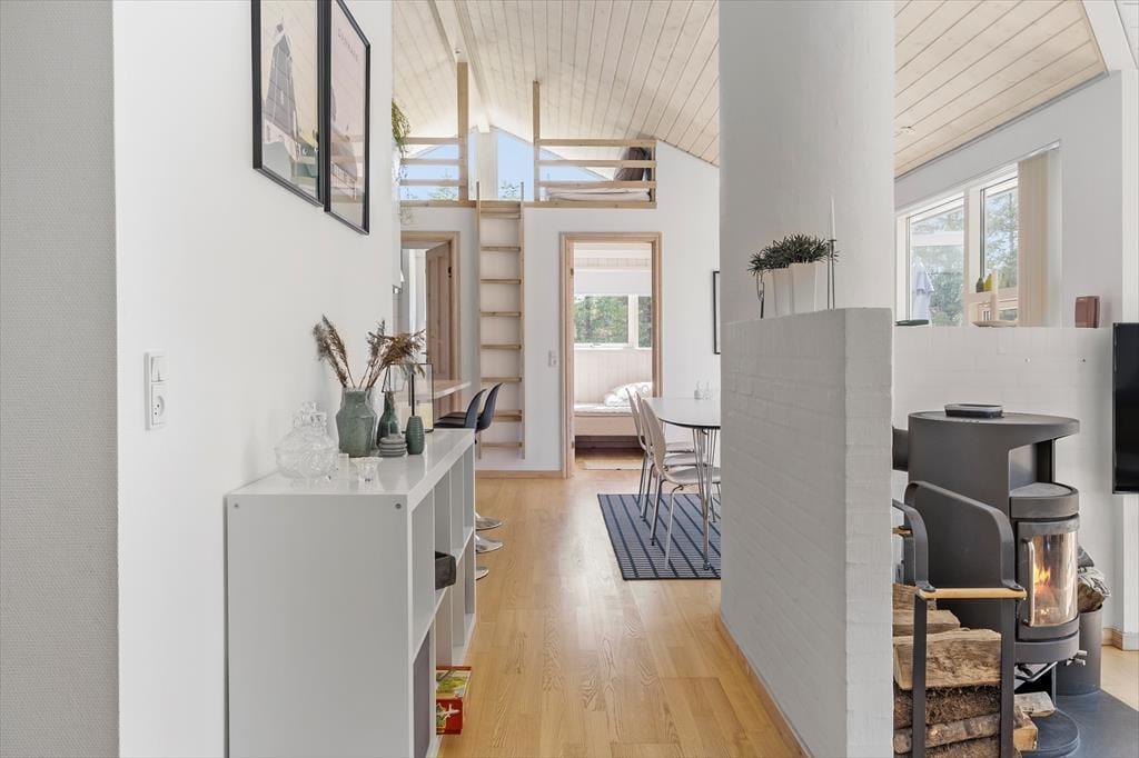 Det 112 m2 store og moderne indrettede sommerhus er en dejlig base for børnefamilier og alle andre, der trænger til at slappe af og nyde ferien i ro og mag. Fordi der er fire soveværelser og to badeværelser inden døre, kan I endda oplagt invitere bedsteforældrene eller jeres gode venner med på ferie – så er der måske endda lidt hjælp til at underholde børnene, hvis I får lyst til en rolig wellness-stund med sauna og spabad. Alle kan mødes om det store spisebord til lækre måltider, som I kan lave i det veludstyrede køkken. Her er der for øvrigt også en disk med barstole, så under madlavningen kan det blive et samlingspunkt for de, der vil hyggesnakke over en kølig drink. Stuens sofaafdeling er en stor og skøn hyggekrog med brændeovn og fladskærms-tv, og de yngste gæster vil formentlig hurtigt blive vilde med hemsen, der kan fungere som deres private lille udsigtspost.