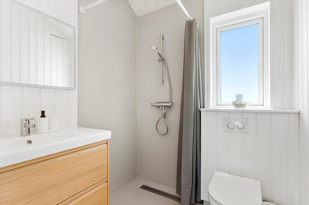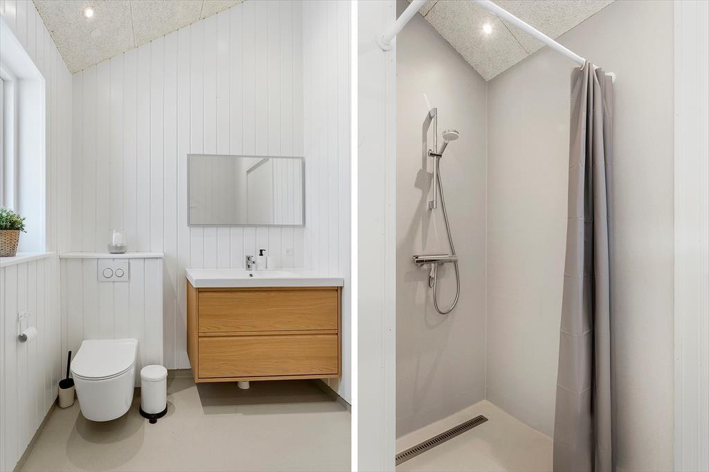 Det 105 m2 store sommerhus har en glimrende planløsning, der nemt kan rumme op til seks voksne og to børn. I den ene ende ligger soveafsnittet, der består af tre gode soveværelser og to badeværelser. Der er ikke bare en, men to hemse i huset, hvor der også er mulighed for at overnatte – og i løbet af dagen kan de sikkert blive et hit, hvis børnene vil lege eller læse lidt i fred for de voksne. Når I alle vil samles, er stuen et skønt opholdsrum. Store vinduer inviterer dagslyset indenfor, møblementet sørger for god komfort, og den åbne forbindelse til køkkenet betyder, at I sagtens kan hyggesnakke, selvom der skal skylles salat og røres i gryderne. Som man kan forvente af et nybyggeri fra 2024, er faciliteterne i orden, og der er alt, lige fra fladskærms-tv og hurtigt internet til varmepumpe med køl.