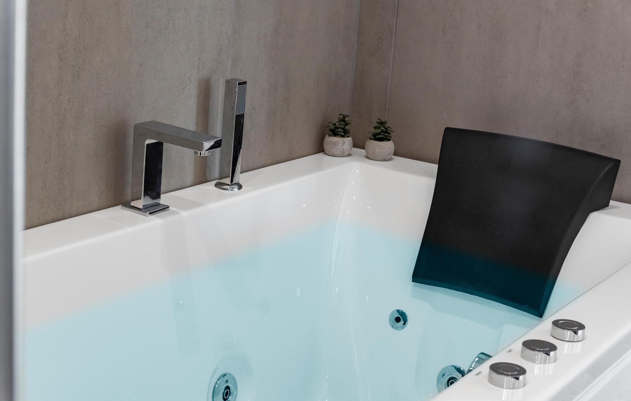 En særlig wellnessoplevelse venter jer på terrassen, som er udstyret med et udendørs spabad, hvor I kan slappe helt af. Også på badeværelset finder I et spabad. Derudover byder den store terrasse på masser af plads til afslapning og til at nyde den smukke udsigt.