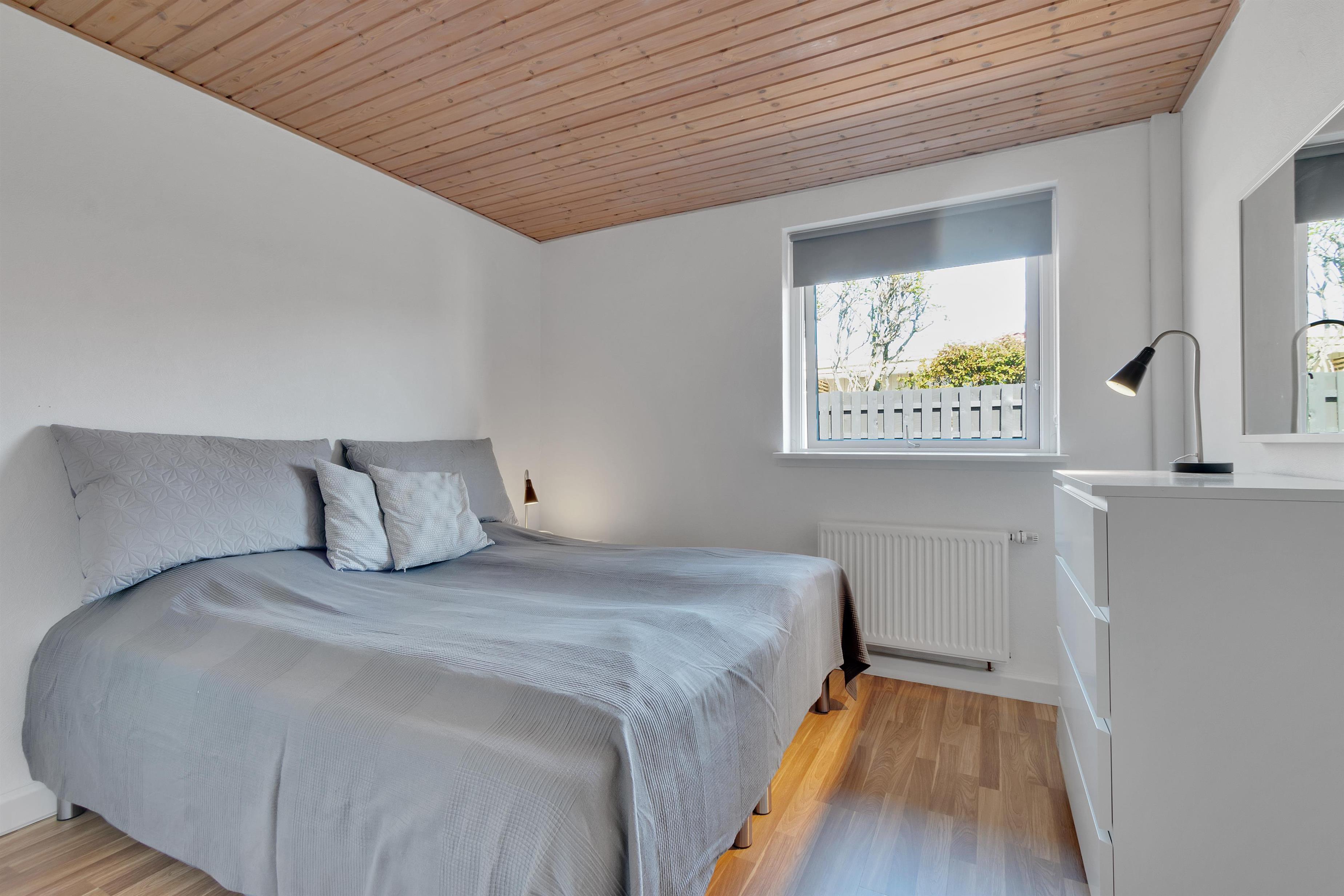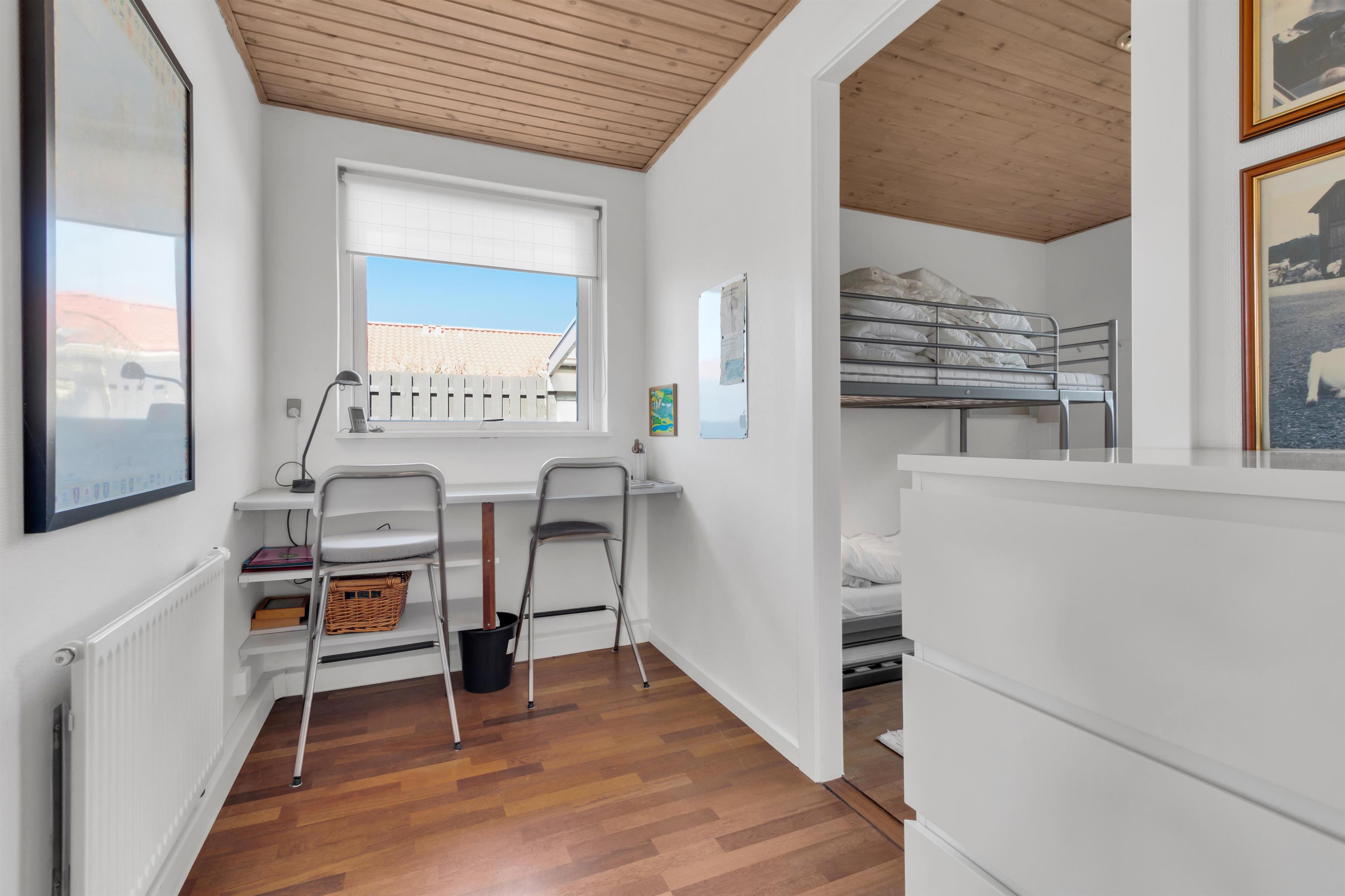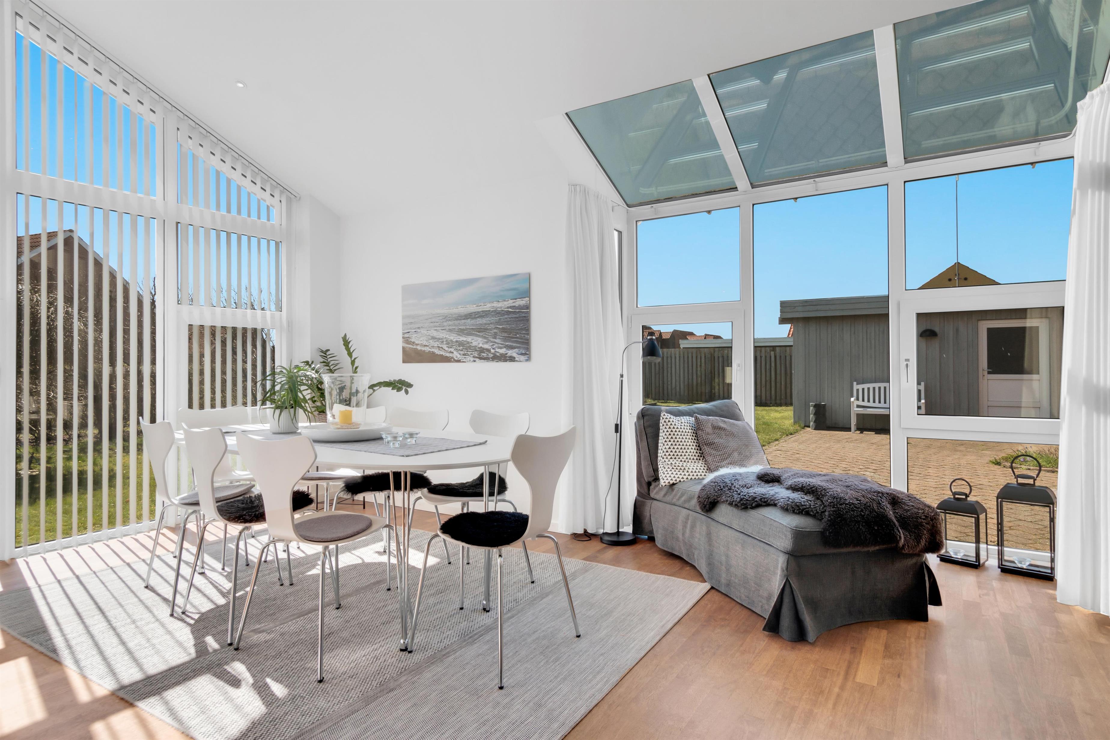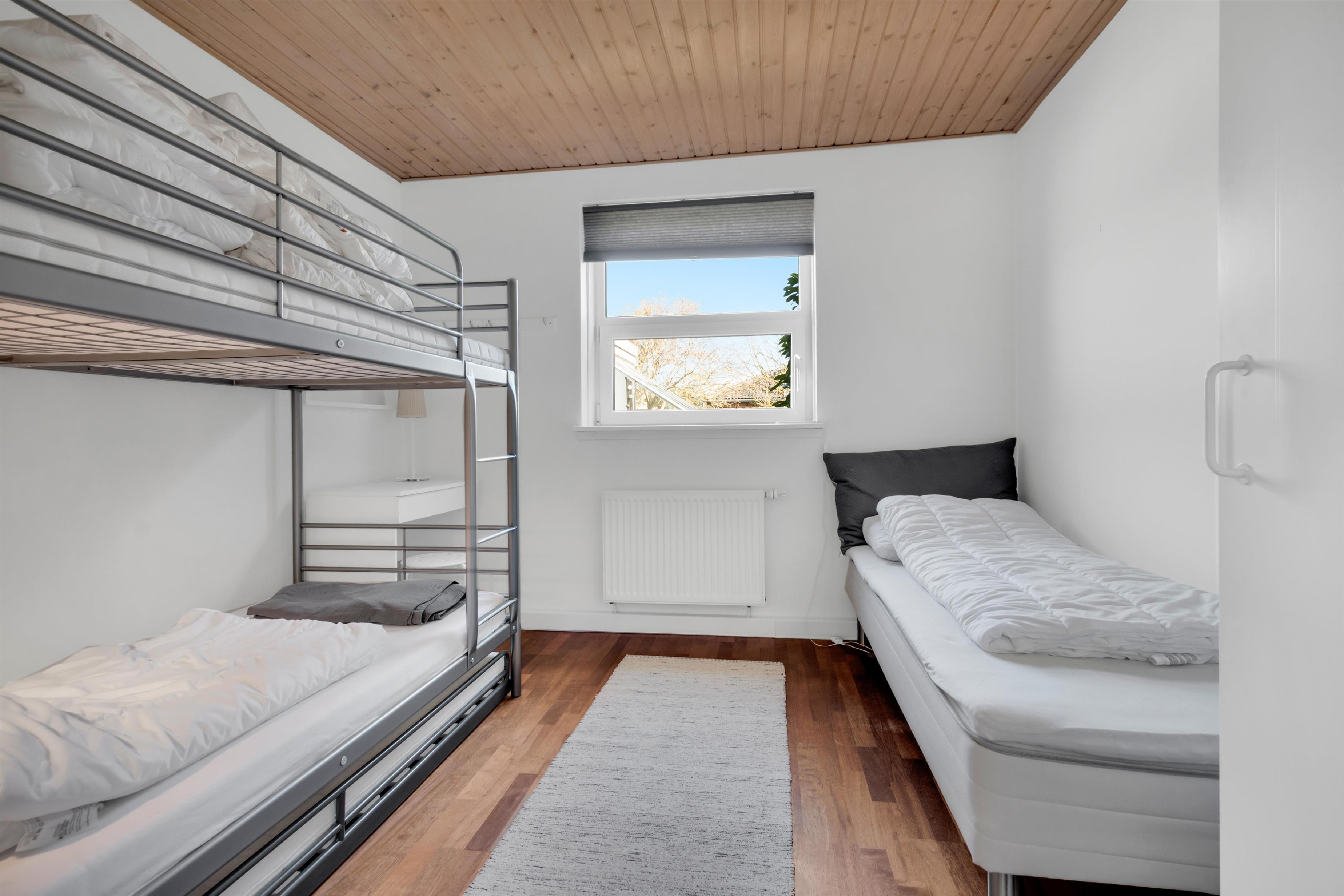 Ud over at boligen kan rumme hele 9 personer, må husets hjerte siges at være det utroligt skønne opholdsrum med store vinduespartier og et fantastisk lysindfald. Her er en chaiselong at slænge sig i, et stort spisebord samt en rigtig flydersofa foran brændeovnen. Til den ene side er der dobbeltdøre fra opholdsrummet og ud til køkkenet, hvor der ligeledes er ekstra spiseplads, og til den anden side er der udgang til den dejlige, afskærmede have. Der er fire soverum og sovepladserne er fordelt på køjesenge, enkeltsenge, dobbeltseng og sovesofa - og dertil en barneseng. Køkkenet er dejligt åbent og der er fjernvarme i huset, hvilket er en billig varmekilde. Der er et enkelt badeværelse med toilet, et ekstra toilet og et skønt bryggers.