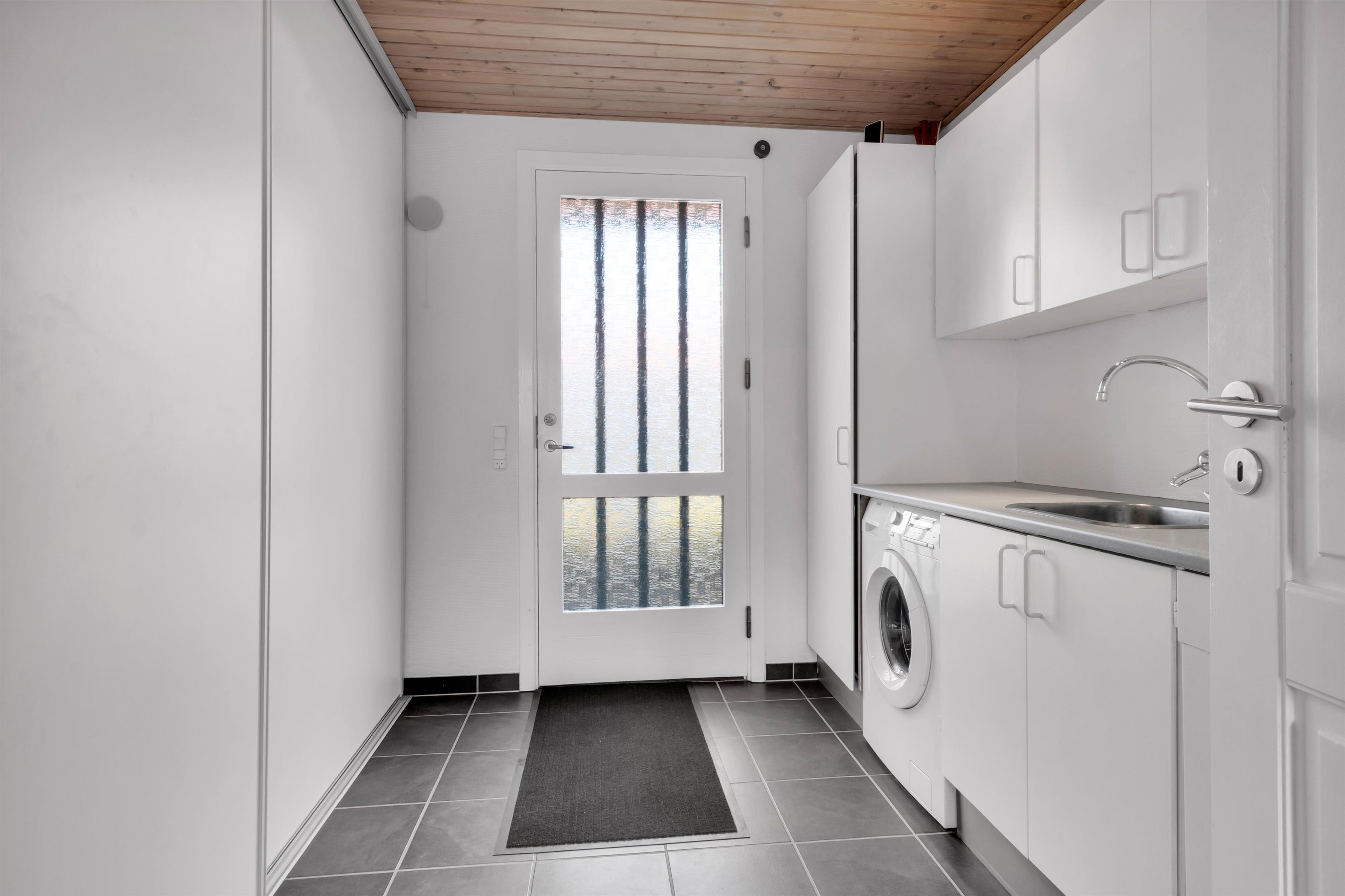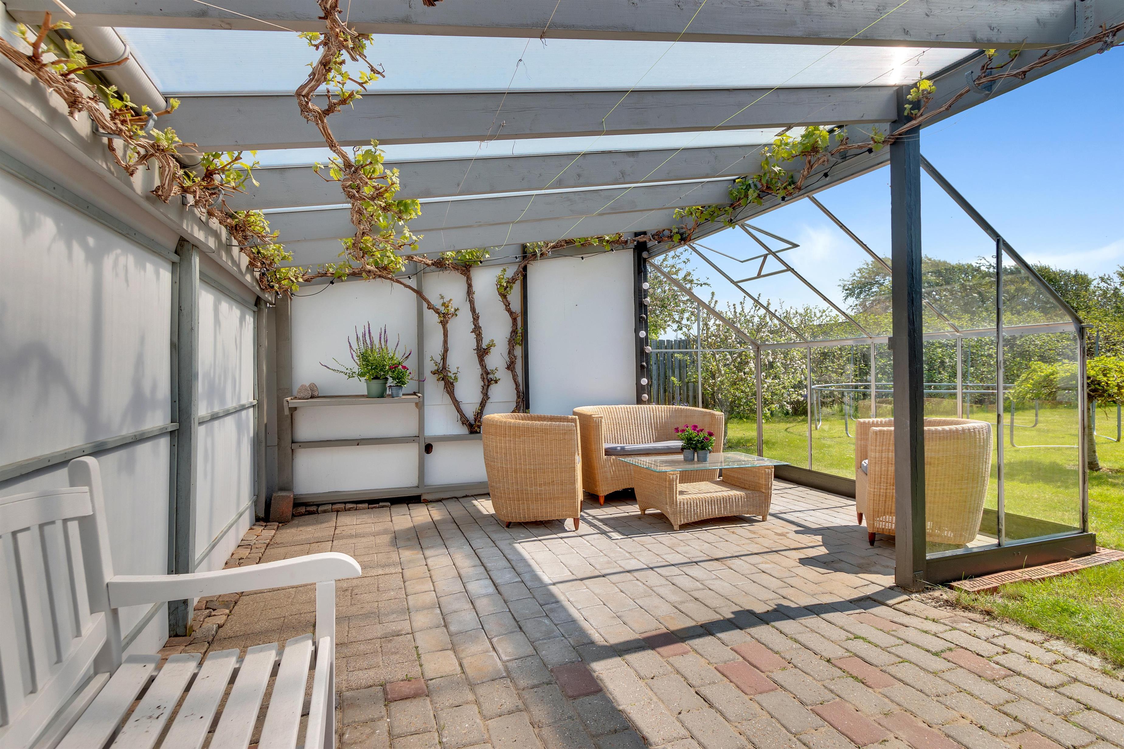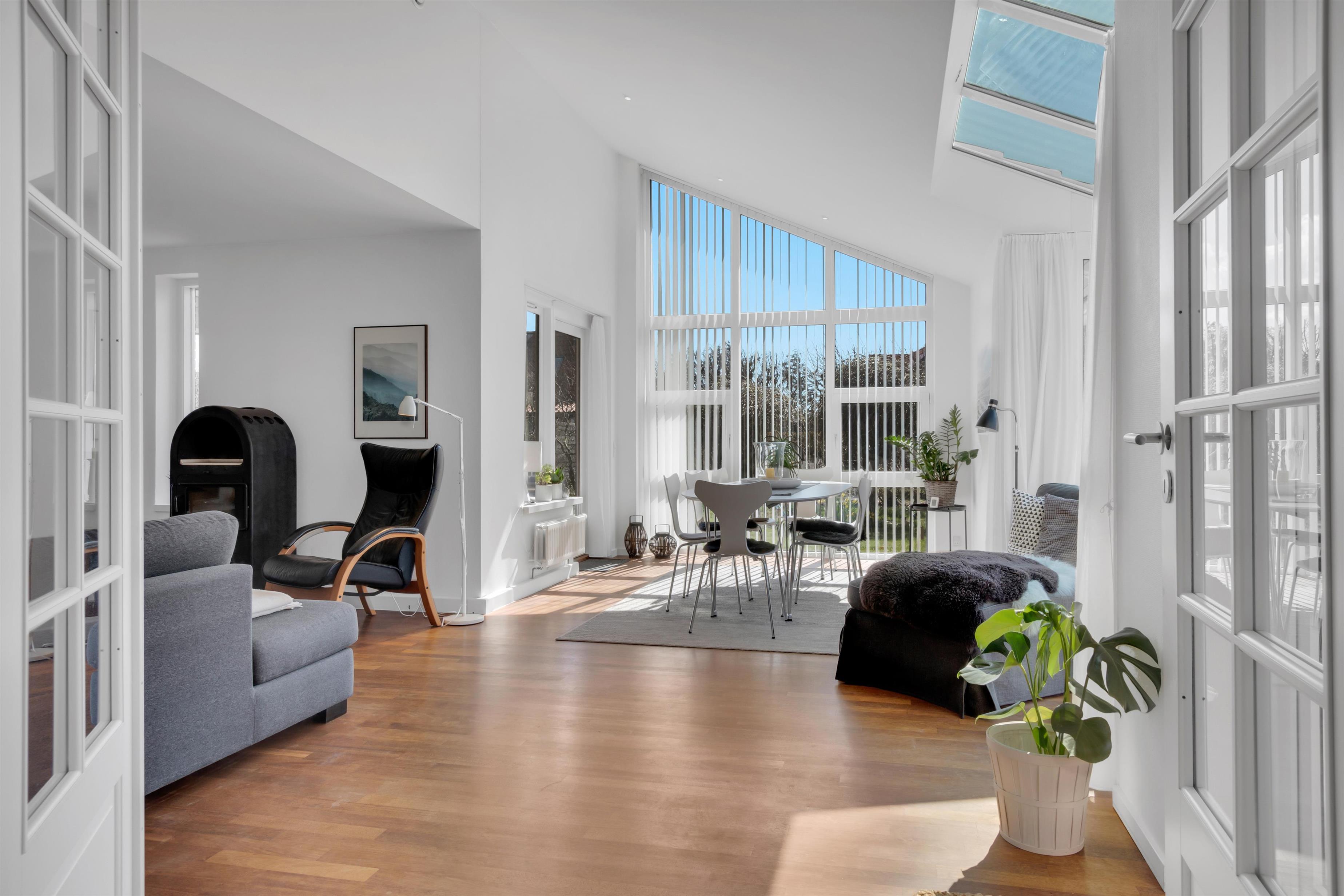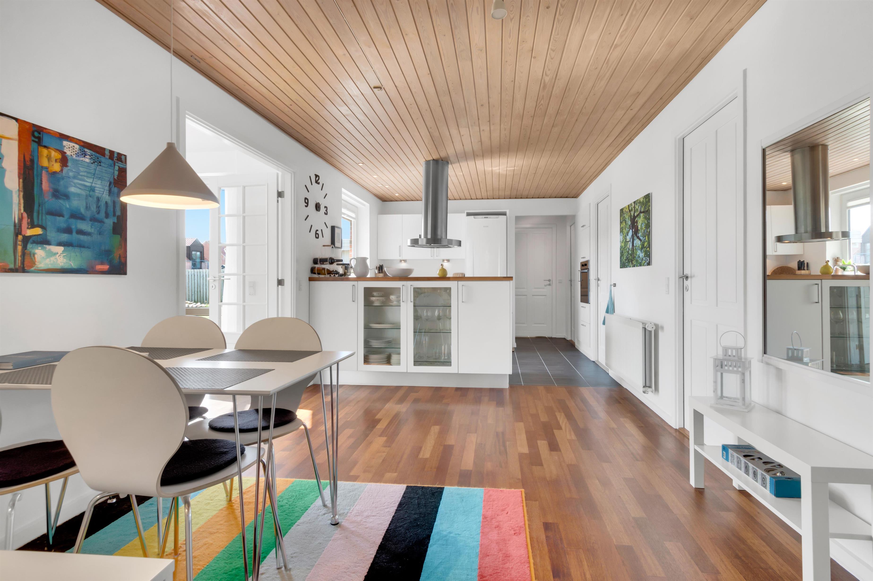 Ud over at boligen kan rumme hele 9 personer, må husets hjerte siges at være det utroligt skønne opholdsrum med store vinduespartier og et fantastisk lysindfald. Her er en chaiselong at slænge sig i, et stort spisebord samt en rigtig flydersofa foran brændeovnen. Til den ene side er der dobbeltdøre fra opholdsrummet og ud til køkkenet, hvor der ligeledes er ekstra spiseplads, og til den anden side er der udgang til den dejlige, afskærmede have. Der er fire soverum og sovepladserne er fordelt på køjesenge, enkeltsenge, dobbeltseng og sovesofa - og dertil en barneseng. Køkkenet er dejligt åbent og der er fjernvarme i huset, hvilket er en billig varmekilde. Der er et enkelt badeværelse med toilet, et ekstra toilet og et skønt bryggers.