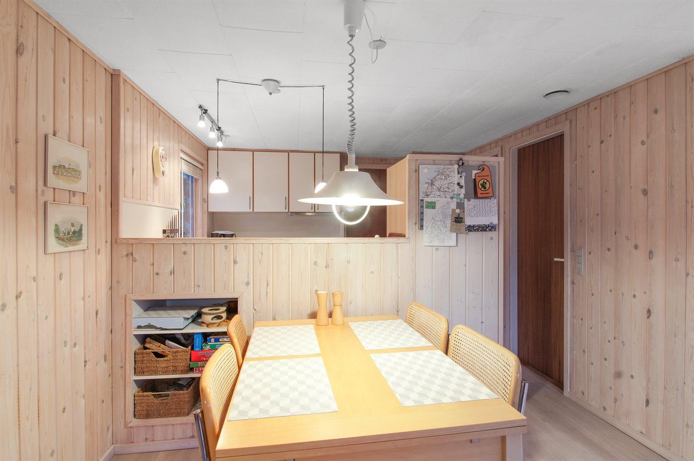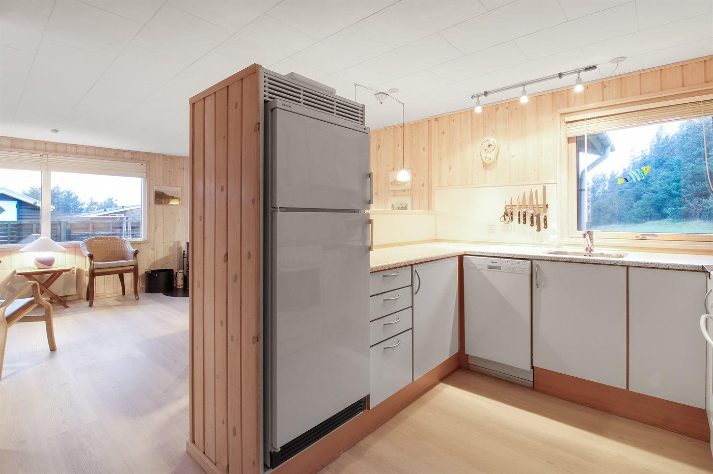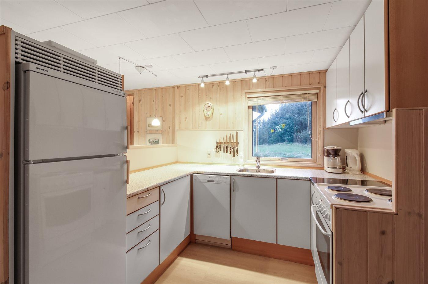 Køkkenet er udstyret med 1 køleskab. Der er 4 keramiske kogeplader, varmluftovn, mikrobølgeovn samt opvaskemaskine.