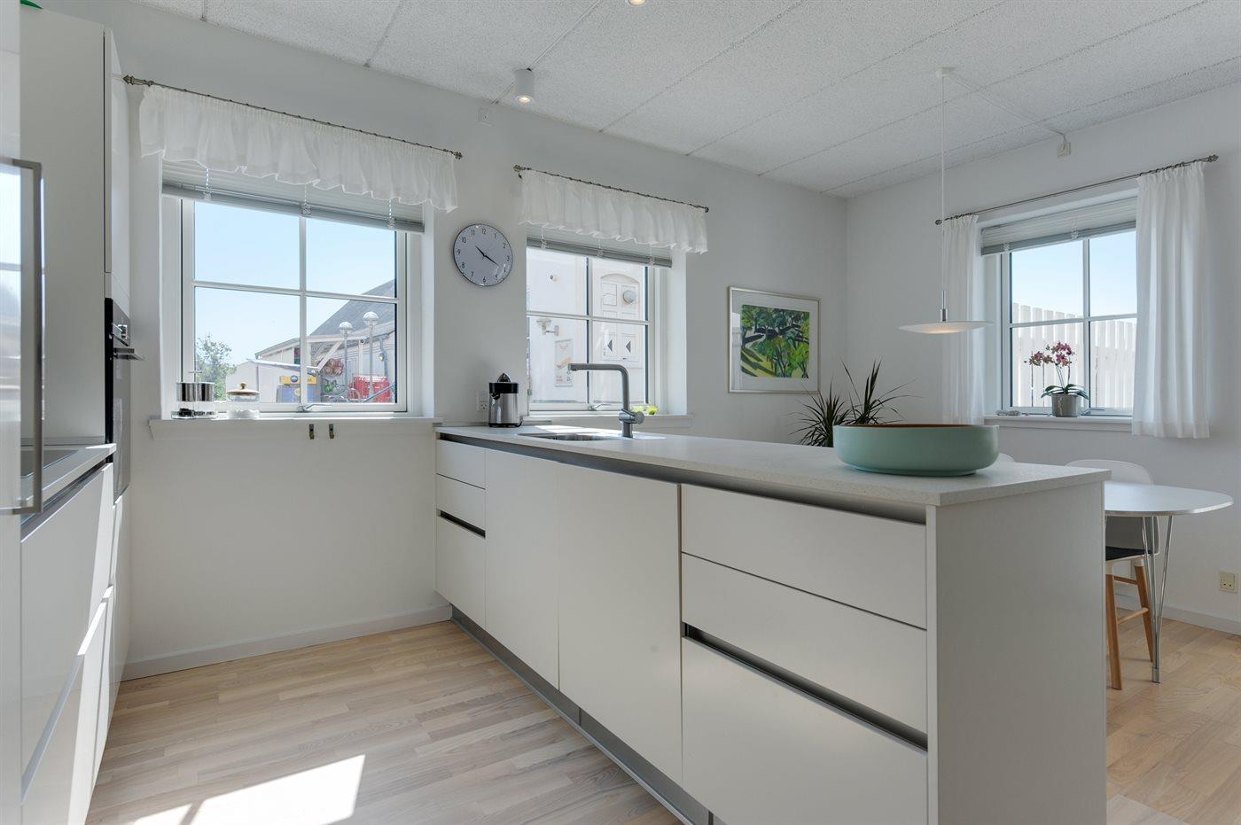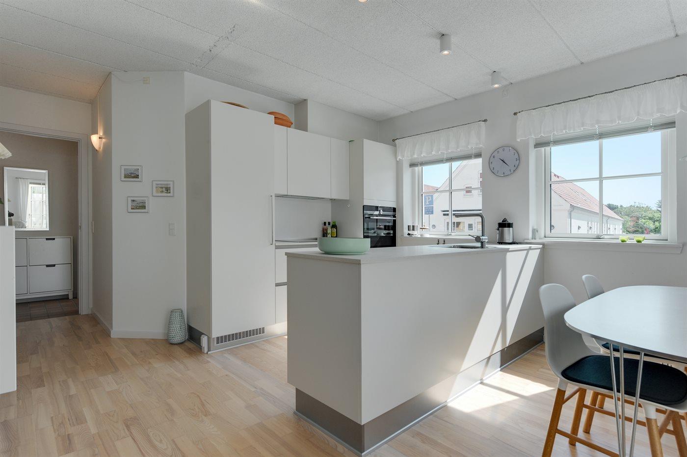 Køkkenet er udstyret med 1 køleskab. Der er 4 induktionskogeplader, varmluftovn samt opvaskemaskine.