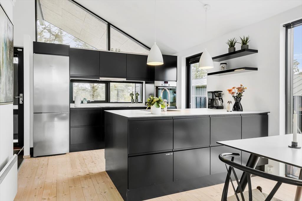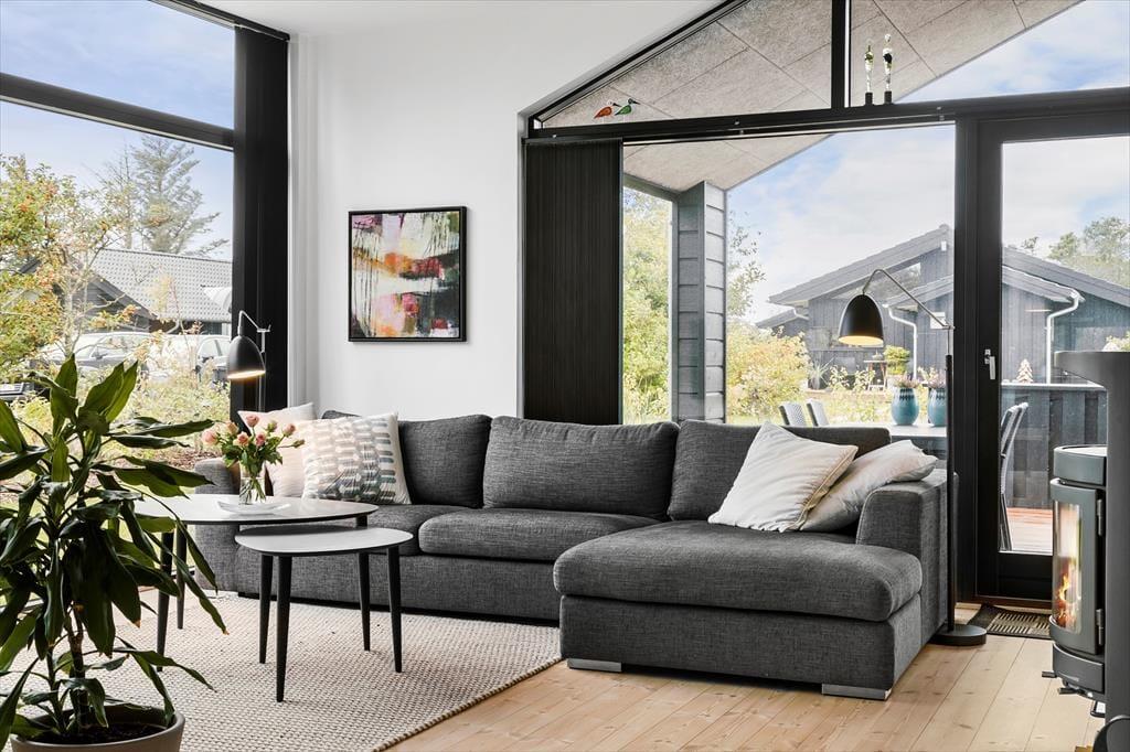 Inden døre er atmosfæren lys og indbydende, for de mange og store vinduer sørger for et flot lysindfald i løbet af dagen. Det gælder ikke mindst for stuen, som er et smukt opholdsrum med åbent køkken, spisebord og sofaafdeling med brændeovn. Husets øvrige rum, der tæller tre soveværelser og to badeværelser, er også både stilfuldt og komfortabelt indrettet, og på det ene badeværelse er der endda installeret et spabad, så I kan slappe af med et varmt bad om aftenen. Aftenhyggen kan også byde på en god film, for i stuen er der koblet Chromecast til TV’et, så I nemt kan streame lige det, I ønsker.