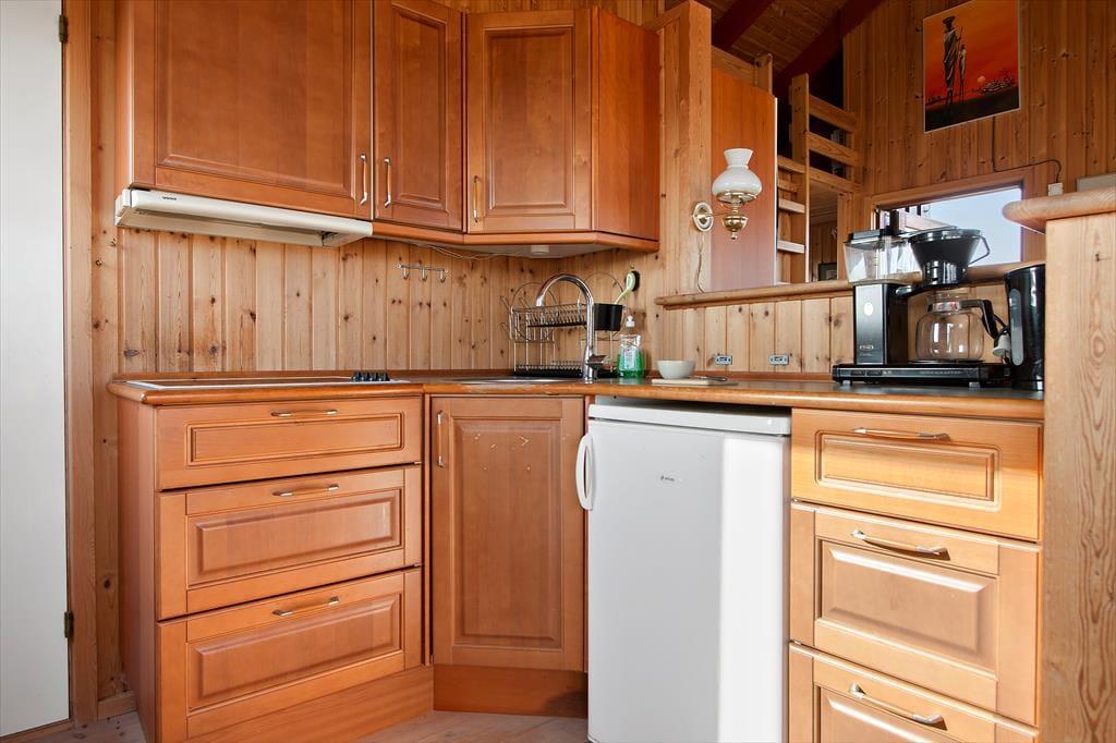 Indenfor finder du et enkelt, ældre interiør med træpaneler og den klassiske sommerhusstemning og med store vinduer, der lukker naturen og lyset ind. Huset rummer en opholdsstue i åben forbindelse med køkkenet samt et badeværelse med bruser – ideelt til et par, der ønsker en afslappet ferie tæt på naturen.