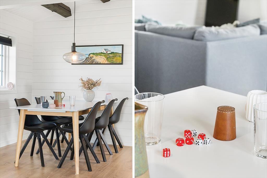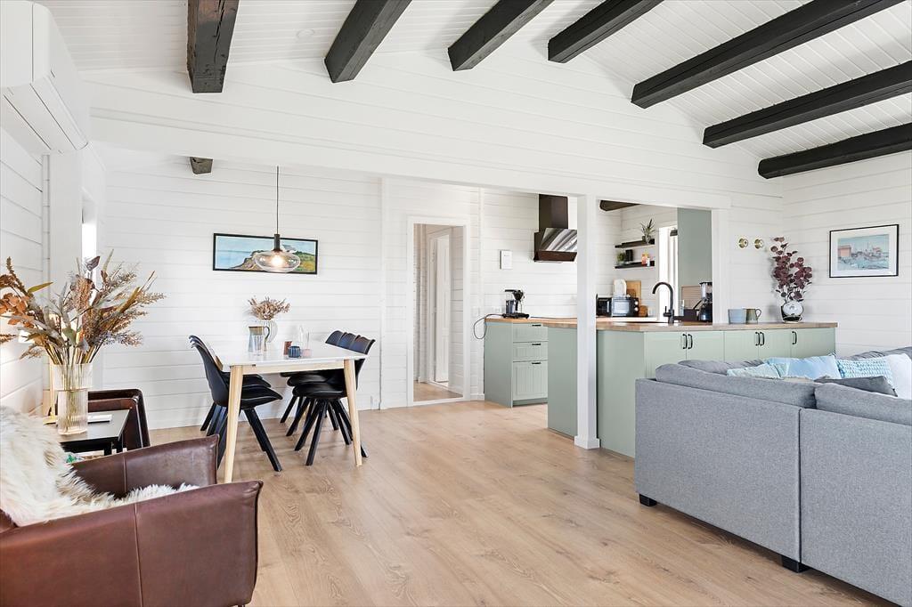 Når du træder ind i sommerhuset, bliver du straks mødt af den lyse og moderne indretning, der giver en følelse af rummelighed og ro. De store vinduer sørger for, at lyset strømmer ind og åbner op for den fantastiske panoramaview over havet. Stuen er stilfuldt indrettet med komfortable møbler, der indbyder til afslapning – perfekt til både en rolig morgen med en varm kop kaffe eller en hyggelig aften foran flimmeren fra tv’et. Den åbne planløsning og de enkle, men elegante møbler gør det muligt at nyde både samvær og stilhed, alt efter hvad du har lyst til. Med en brændeovn til de kolde aftener og en indretning, der blander moderne design med varme elementer, føles dette sommerhus som et hjem væk fra hjemmet.