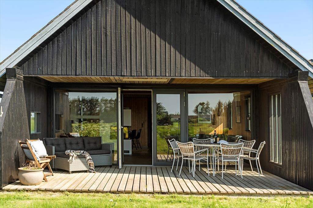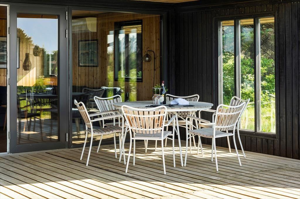 I forlængelse af stuen ligger en delvist overdækket terrasse, og det er den oplagte opholdsplads, hvis du vil nyde udsigten til Rubjerg Knude Fyr, mens du slikker sol og lytter til fuglesang. Mellem huset og tilbygningen venter der også en læfyldt solkrog, og der er også en bænk, hvis du til en afveksling vil sidde med tæerne i græsset og være lidt tættere på naturgrundens bevoksning. Om aftenen er der mulighed for at grille, så uanset om du er til bøffer, fisk eller majskolber, kan du glæde dig til at dække op under åben himmel og lade duften sprede sig.
