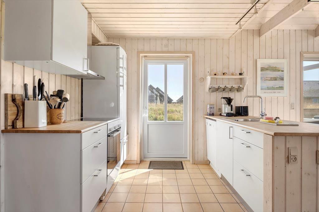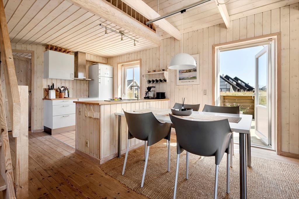 Det første, der møder dig, når du træder ind ad døren, er det lyse og åbne indtryk, der præger hele boligen. Indretningen er gennemført hyggelig med en afslappet feriestemning, og vinduerne i stuen trækker ikke bare dagslyset helt ind i rummet – de giver dig også et skønt kig til havet, som ligger lige i nærheden. Her er det nemt at slå sig ned med en kop kaffe og lade blikket vandre mod horisonten, mens tankerne flyver frit. Det åbne opholdsrum skaber en god ramme for både nærvær og samtaler, og du vil hurtigt mærke, hvordan roen sænker sig, når I samles her efter en dag i det fri. Uanset om du er til rolige morgener med morgenmad og havudsigt eller spil og snak omkring spisebordet om aftenen, lægger lejligheden op til kvalitetstid i afslappede rammer.