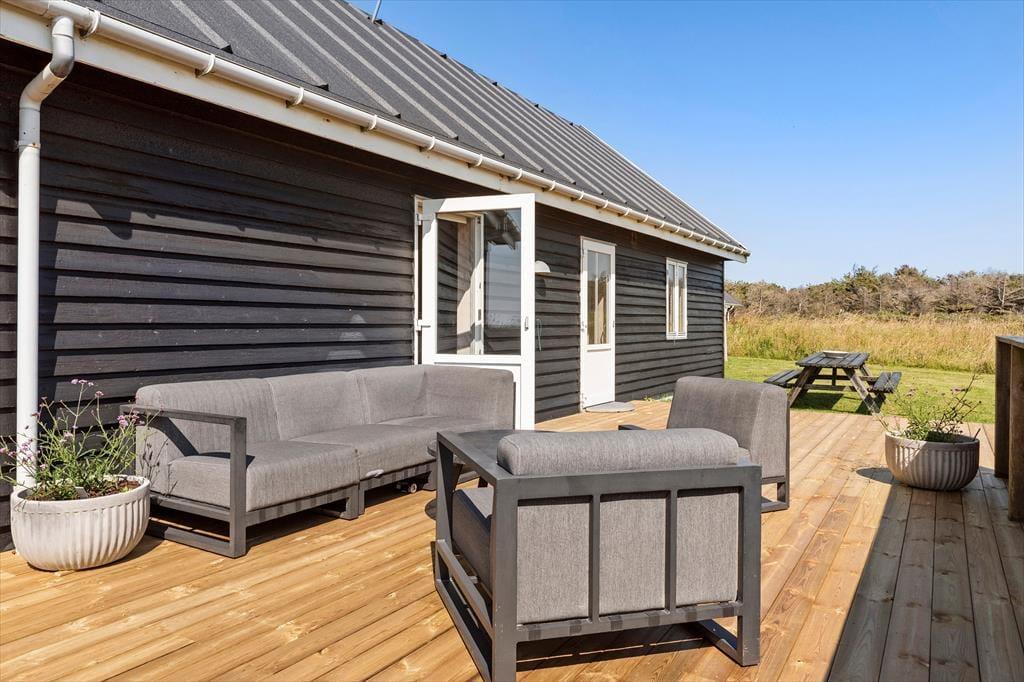 Udenfor venter en stor, grøn have med plads til både leg og afslapning. Måske har børnene lyst til at løbe rundt og spille bold, mens de voksne nyder solen i liggestolene? Terrassen er rummelig og veldisponeret, så du nemt kan finde din favoritplads – hvad enten du foretrækker at mærke solens varme eller bare slappe af med en god bog i fred og ro. Med udsigten til havet som kulisse kan I lade feriedagene flyde i et langsomt tempo og måske slutte dagen af med et glas vin og kig til solnedgangen fra terrassen. Det er ferieidyl på første række – og når mørket falder på, er det svært ikke at glæde sig til endnu en dag her.