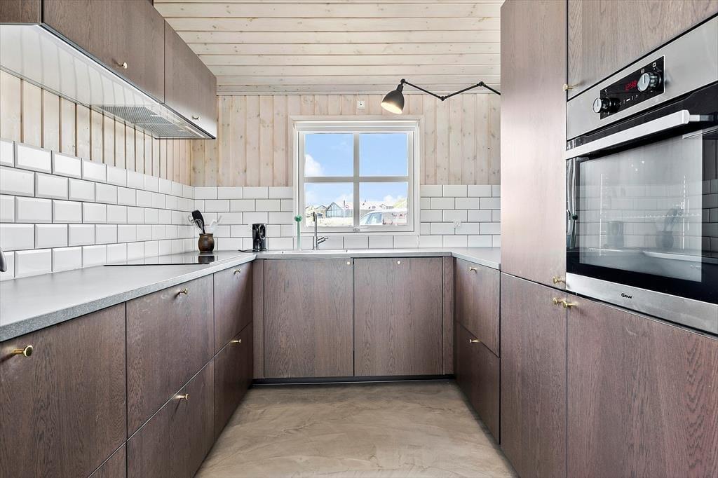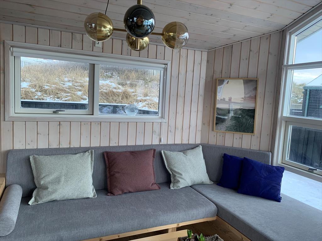 Sommerhuset er lyst indrettet med loft til kip og store panoramavinduer. Køkkenet ligger i åben forbindelse til stuen, som er indrettet med moderne og komfortable møbler. Der er brændeovn i stuen, som giver en dejlig varme og en hyggelig stemning. Der er to værelser. Et med dobbeltseng og et med en dobbelt sovesofa. Der er en ekstra sovemulighed på hemsen som har to madrasser.