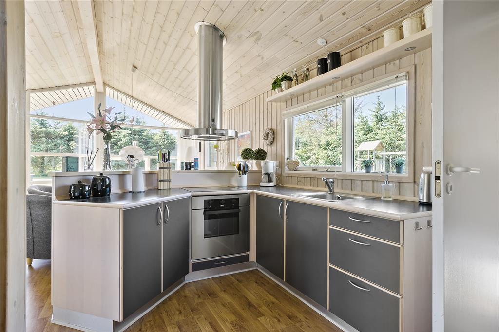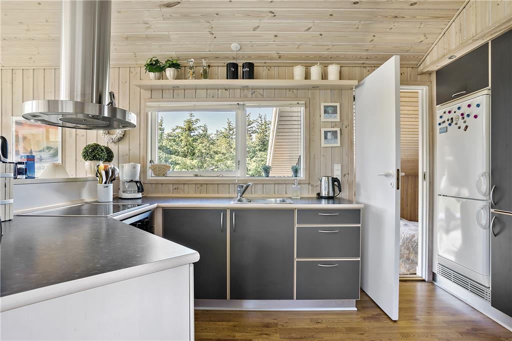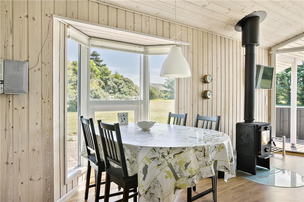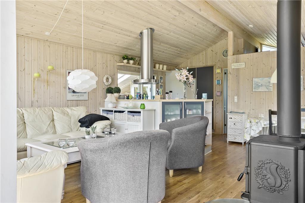Dette lille sommerhus er hyggeligt og lyst indrettet og husets 51 kvadratmeter er godt udnyttet. Det vedudstyrede lille køkken ligger i åben forbindelse med den hyggelige dagligstue med brændeovn og spiseplads, så man går ikke glip af, hvad der sker i stuen, mens man laver mad til familien. Der er to soveværelser med dobbeltseng og fra det ene værelse er der udgang til en fin terrasse. Bemærk venligst at der er to trin ned fra køkken til det ene af soveværelserne. Badeværelset er lyst og har udover bruseniche også en vaskemaskine, som kan være en fordel, når man kommer hjem med håndklæder og badetøj efter en lang dag på stranden.