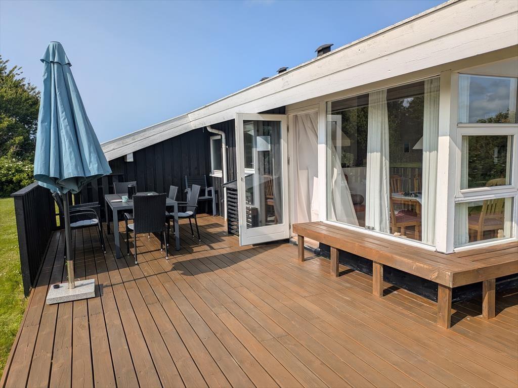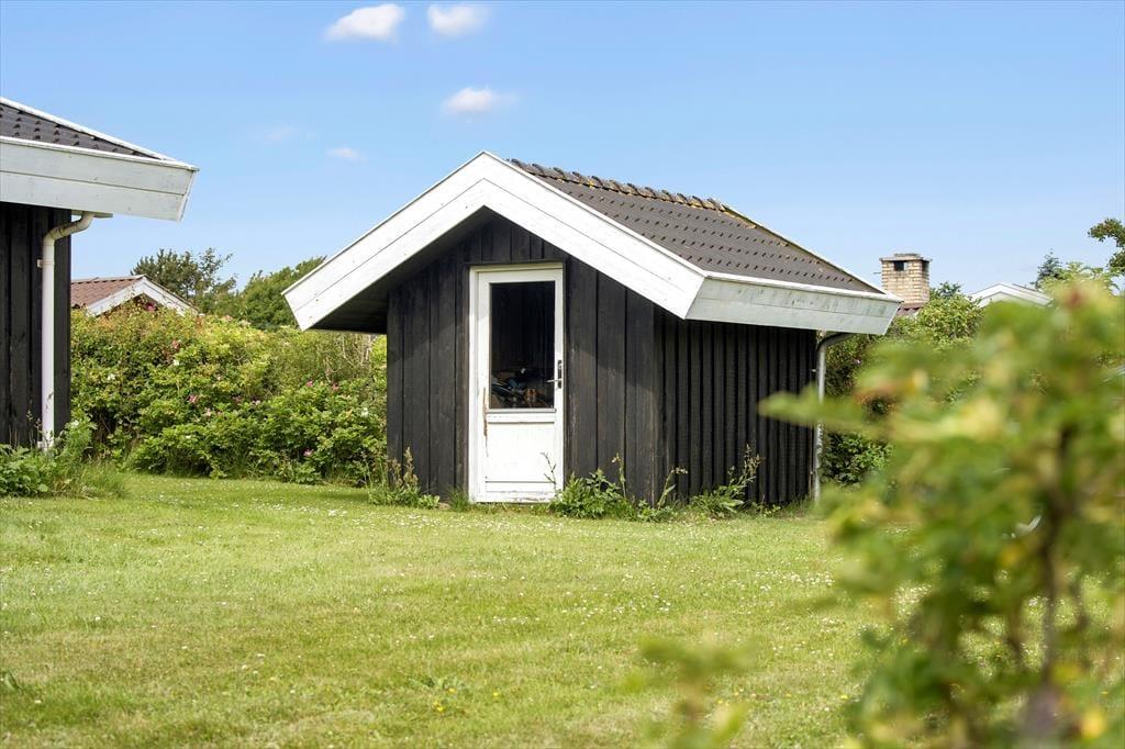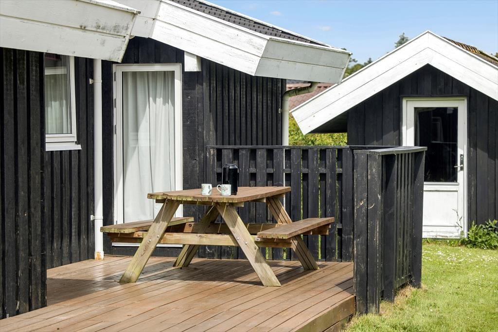 Fra køkken-alrummet er der flere udgange til terrassen, som går et godt stykke rundt om huset. Her er det oplagt at nyde flere af sommerens måltider. Der hører naturligvis også en grill til huset, så man kan tilmed forberede måltiderne udendørs. Der er en stor græsplæne rundt om huset, som indbyder til spil og leg.