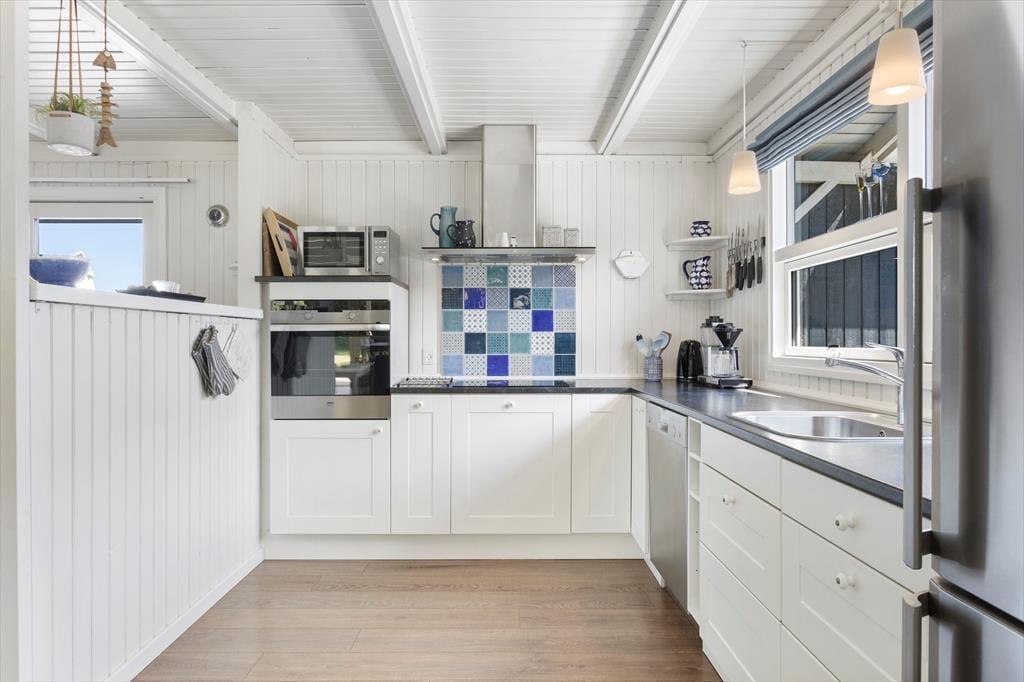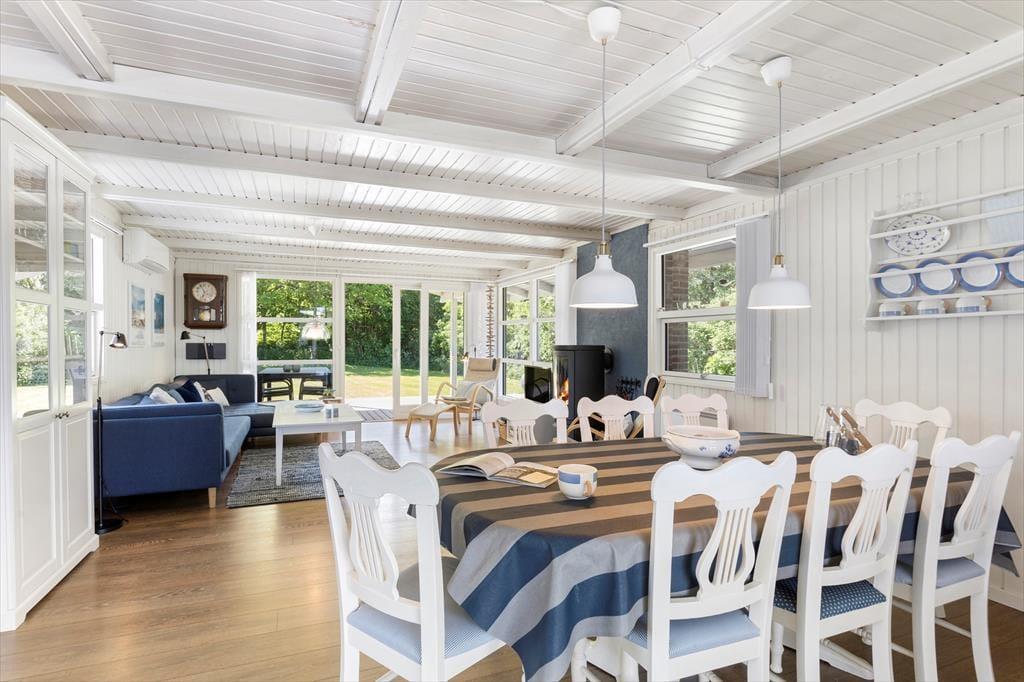 Dette sommerhus tilbyder de ideelle rammer for en vellykket familieferie i det nordjyske. Her er en god kombination af traditionel sommerhusstil med hvide træpaneler og lofter, moderne inventar og udstyr og enkelte flotte og ældre møbler. Med tre værelser i huset og et værelse i det tilhørende anneks er her plads til en stor familie eller to mindre familier, som gerne vil opleve området sammen. Køkkenet ligger i åben forbindelse med spisestuen og stuen med brændeovn og tv, så alle kan være sammen, selvom man laver lidt forskelligt. Sommerhuset er desuden både allergivenligt og børnevenligt med køjeseng, barneseng- og stol og vaskemaskine og tørretumbler. Bemærk, at tv’et kun har 3-4 tyske kanaler, men at man via det trådløse internet kan streame de kanaler, man gerne vil se. Et sommerhus, hvor alle behov for hygge og funktionalitet opfyldes!