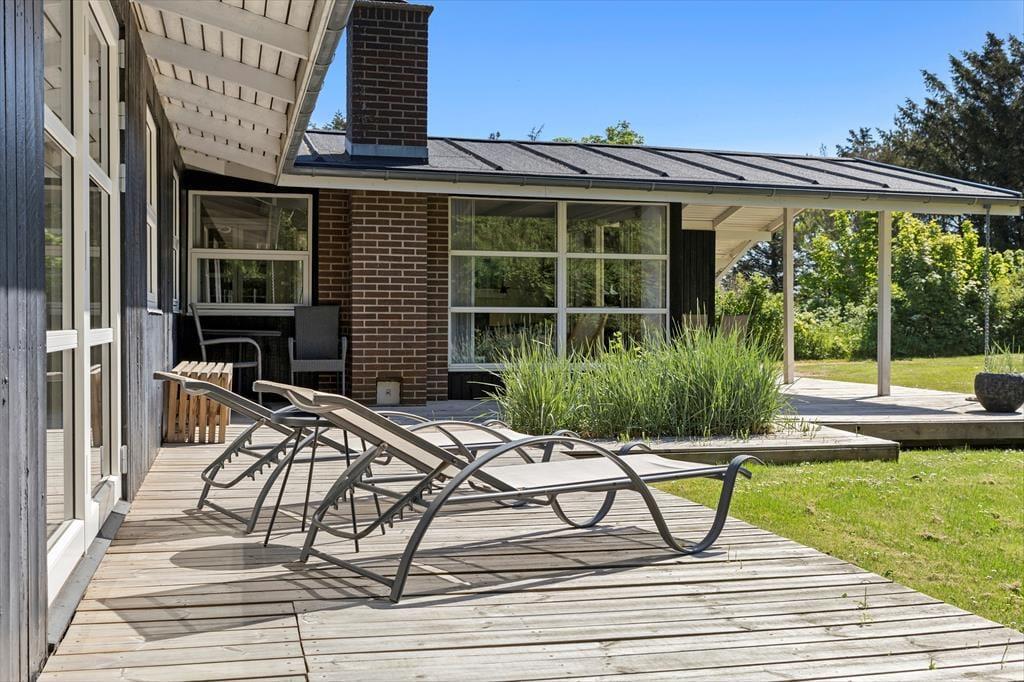 På den store havegrund kan man opholde sig i ro og fred, her er træer og store buske til at skærme grunden af. På terrasserne kan man nyde den danske sommer fuldt ud og altid finde en solplet eller lækrog, alt efter behov. Fra stuen kan man gå ud til en overdækket del af terrassen, hvor det er særdeles hyggeligt at sidde om aftenen, og hvorfra man har et godt overblik over græsplænen, hvor børnene trygt kan lege og løbe rundt.
