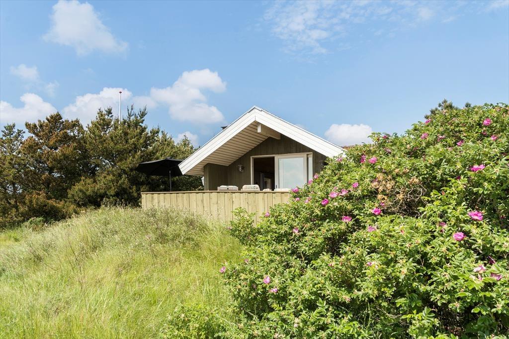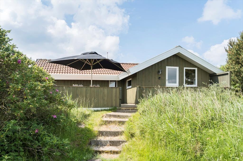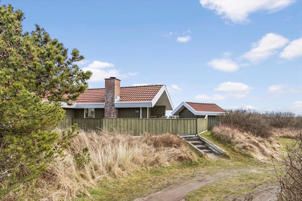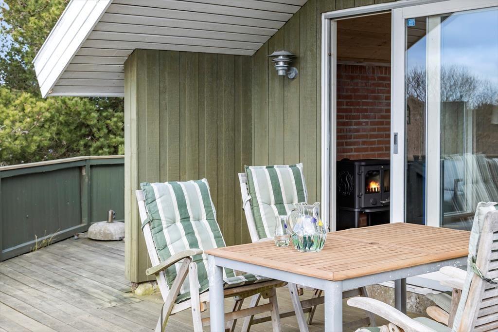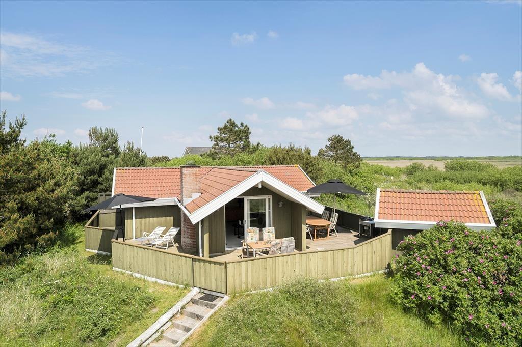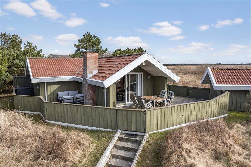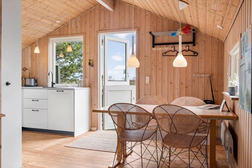 Du kan se frem til mange skønne feriestunder i dette hyggelige træhus på Lakolk 183. Atmosfæren er rar inden døre, og gennem vinduerne kan du se lige ud på den grønne naturgrund og det fredede landskab, der breder sig langt mod øst.