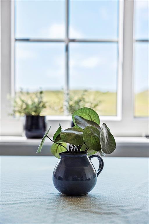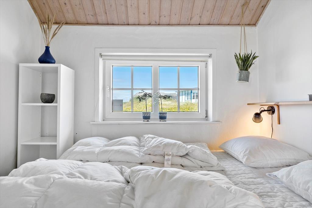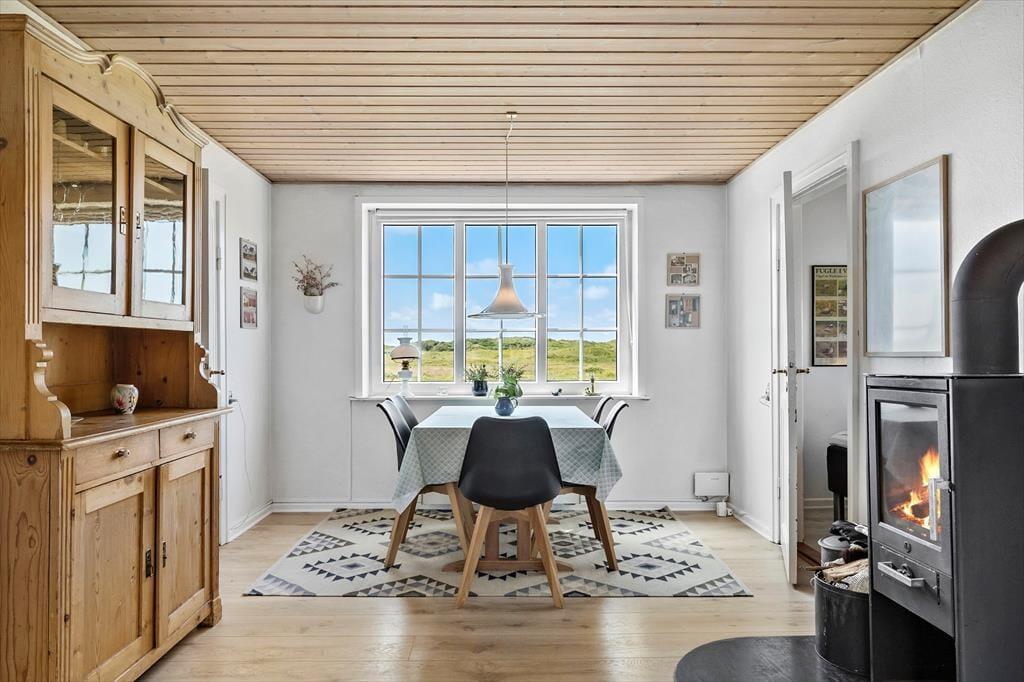Sommerhuset har ligget her blandt de marehalmsklædte klitter siden 1950, og siden er det blevet pænt vedligeholdt og opdateret. Møblementet er nøje udvalgt, så det passer godt ind i murstensejendommens hyggelige rum, og den smukke udsigt, der åbenbares gennem sprossevinduerne, er naturligvis med til at sætte stemningen i vejret. Stuen og køkkenet ligger i åben forbindelse, og det er et herligt opholdsrum med gennemstrømmende lysindfald, brændeovn og en behagelig atmosfære. Den vellykkede planløsning byder også på to soveværelser, hvoraf den ene er udstyret med dobbeltseng og den anden med en køjeseng. På badeværelset er der foruden toilet og bruser installeret en vaskemaskine, så I kan friske garderoben op, hvis I spilder is på sommerkjolen.