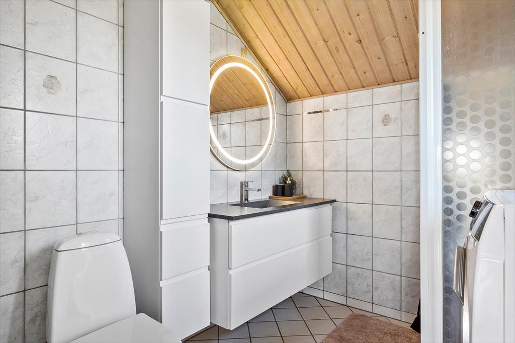 Rundt om sommerhuset er der anlagt flere fliseterrasser samt 32 kvadratmeter terrasse, så det er nemt at finde et sted at nyde solskinsvejret. Udsigten er især imponerende, hvis I sætter jer på husets sydlige eller vestlige side, men øst terrassen kan også anbefales, for den er en dejlig læ fyldt krog med plankeværk som afskærmning.