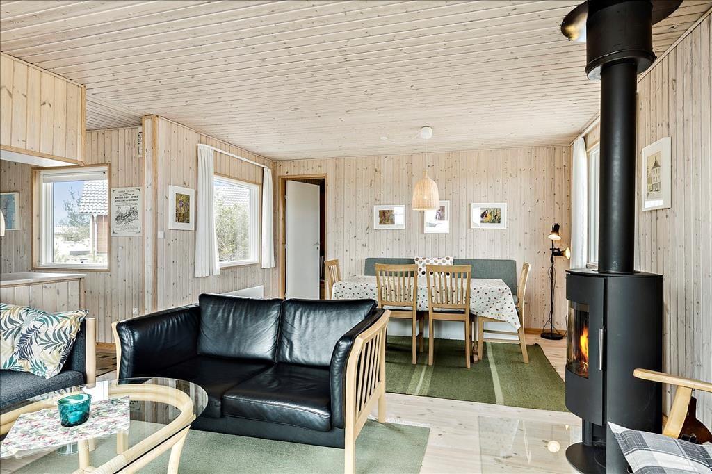 Da det klassiske træsommerhus blev renoveret i 2008, foregik det på grundig manér. Derfor fremstår huset i dag særdeles pænt og indbydende med lys træbeklædning på vægge og lofter, en moderne køkkenafdeling og et ditto badeværelse. På komfortabel vis er der gulvvarme på badeværelset, og der er også installeret en vaskemaskine, så I kan friske garderoben op, hvis I har glemt at pakke nok shorts og sommerkjoler. I køkkenet er der godt med plads, så I kan sagtens være flere kokke om madlavningen – og takket være den åbne planløsning ind til stuen, kan I hyggesnakke med resten af selskabet, mens I rører i gryderne. I stuen er en brændeovn med til at skrue op for den gode atmosfære, og de store vinduespartier sørger for et dejligt lysindfald og åbenbarer den smukke naturudsigt. Når det er tid til at gå til ro, kan I se frem til en god nats søvn på husets tre gode soveværelser.