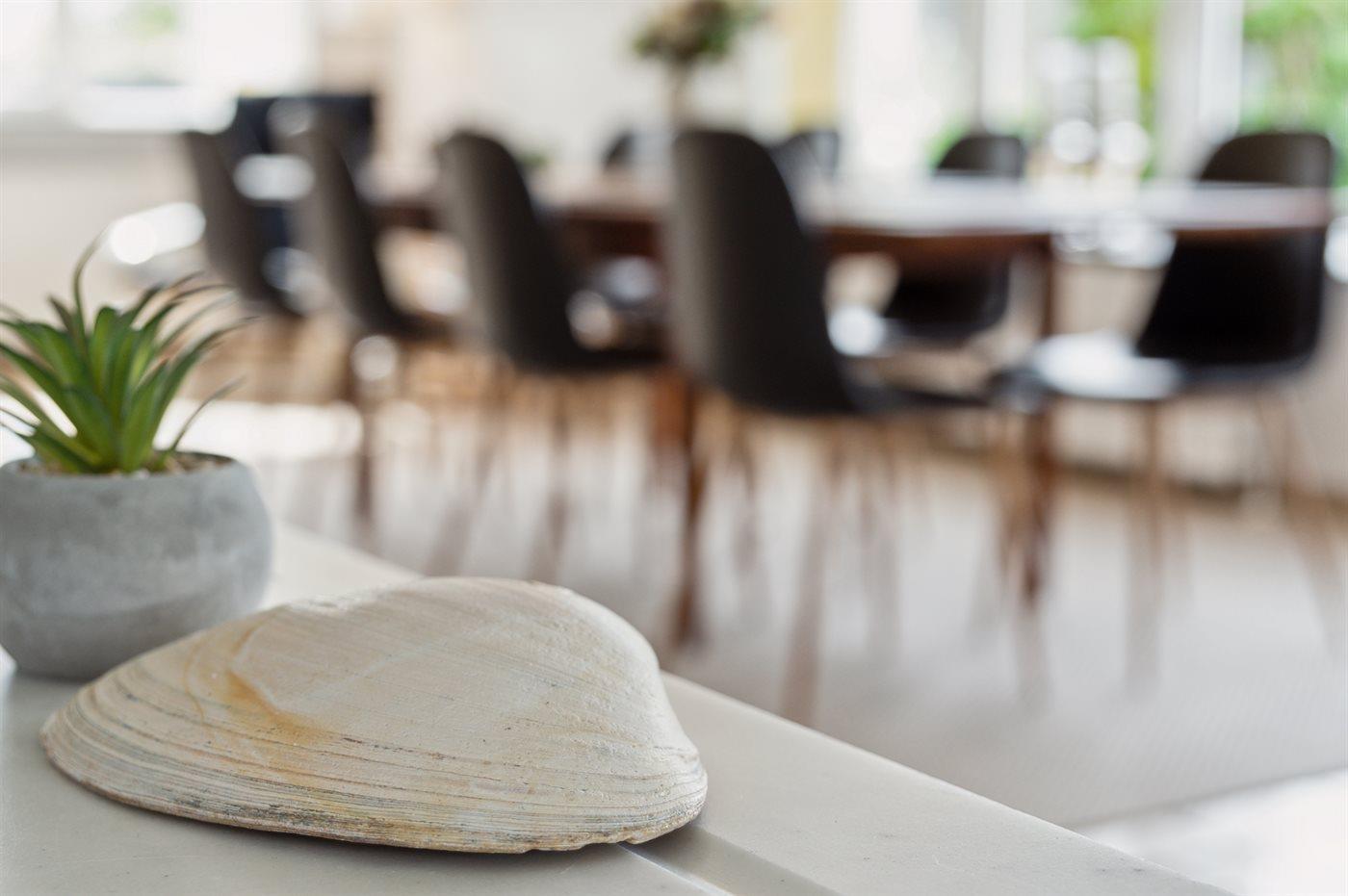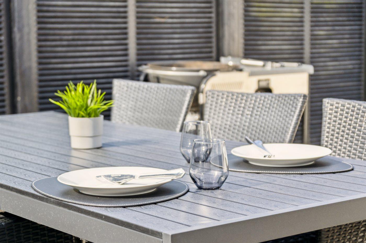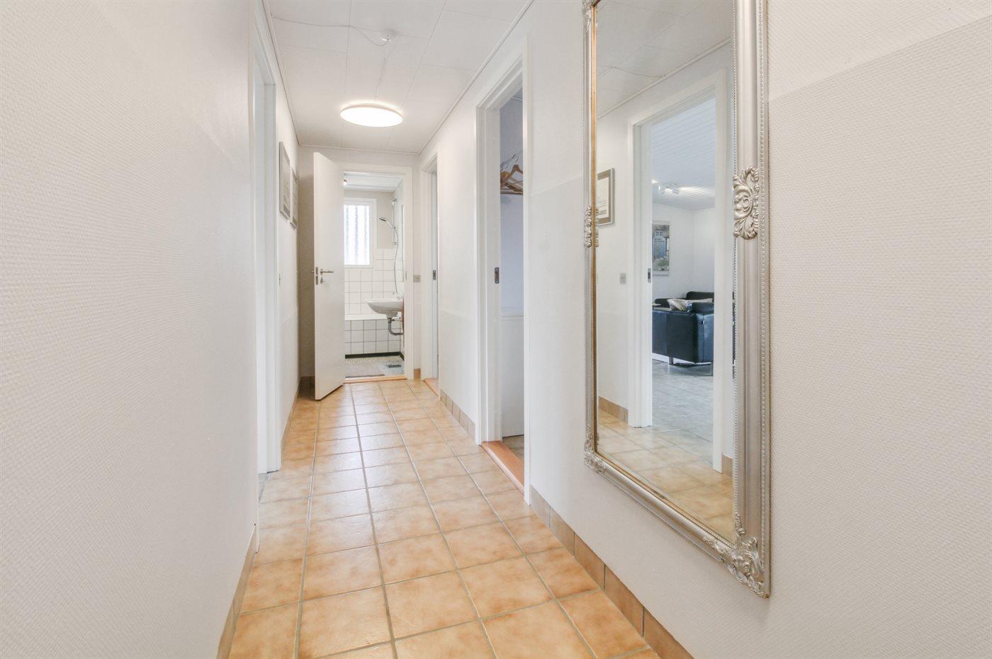 Køkkenet er bl.a. udstyret med 1 køleskab, 4 keramiske kogeplader, varmluftovn, mikrobølgeovn samt opvaskemaskine.