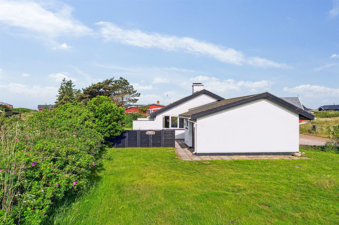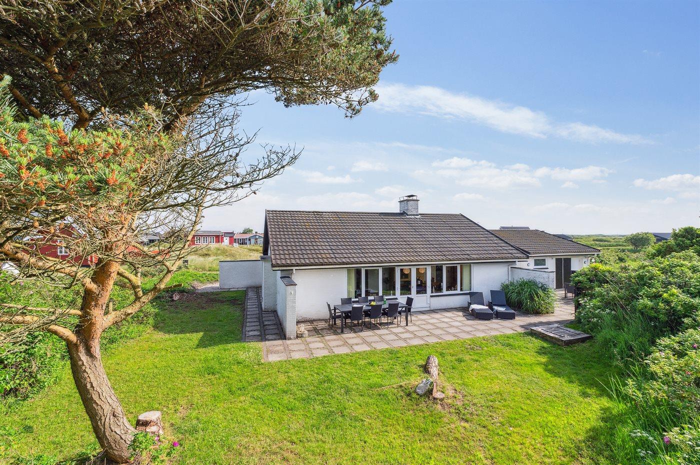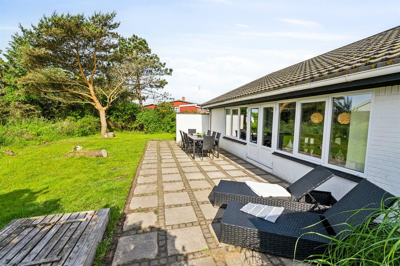 Huset er beliggende på en 1800 m² stor naturgrund. Der er 500 m til havet og nærmeste forretning er beliggende i en afstand af 1200 m. Der findes 50 m² terrasseareal, hvoraf 30 m² er lukket. Sandkasse. Grill til rådighed. Parkering ved ferieboligen.